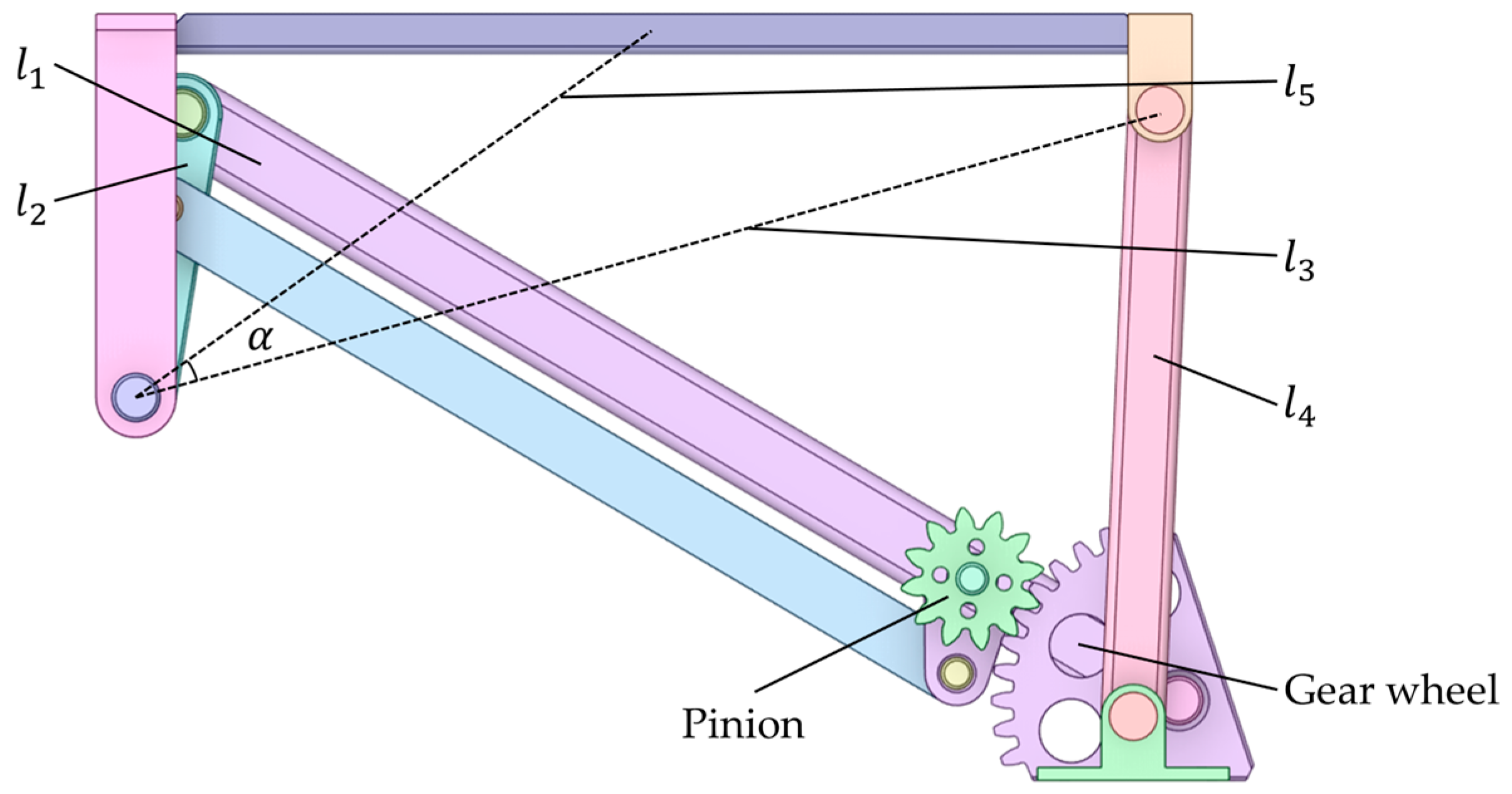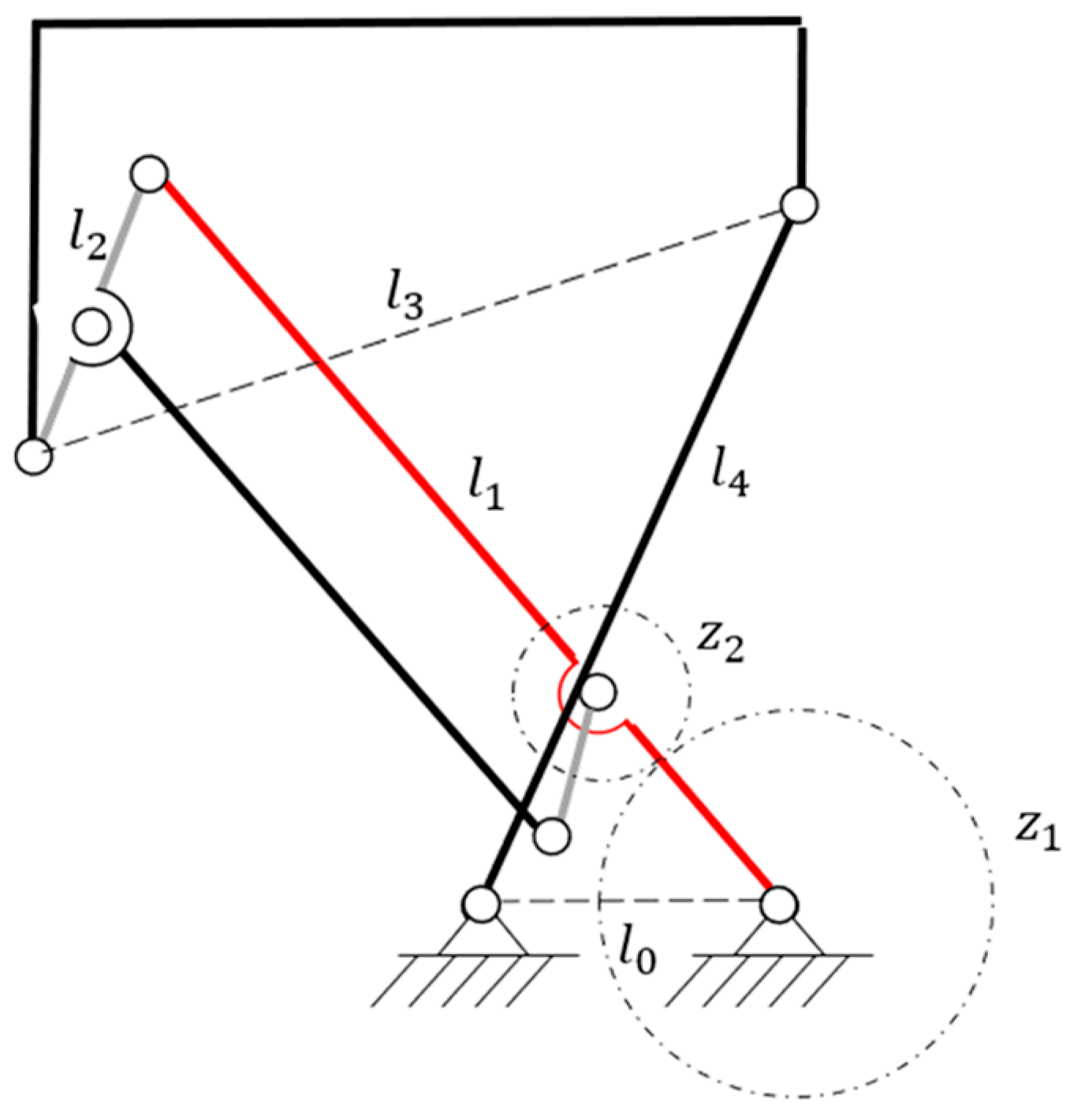 - Al-Smadi, Y.M.; Russell, K.; Sodhi, R.S. Geared Five-Bar Path Generation with Structural Constraints. Inverse Probl. Sci. Eng. 2009, 17, 1059–1072. [Google Scholar] [CrossRef]