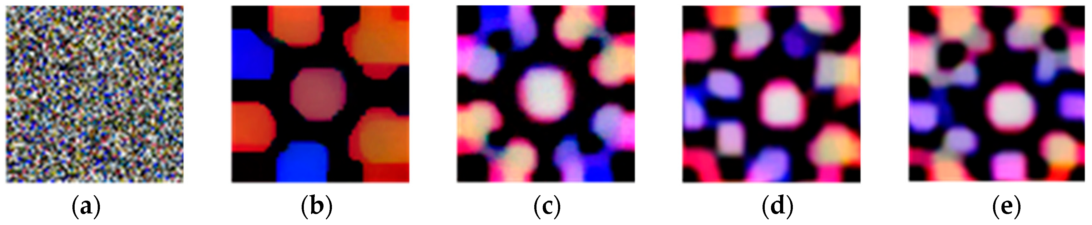 - Data sampling. To ensure the comprehensiveness of the color distribution obtained through sampling and to control the computational complexity, we employed a two-stage sampling algorithm to extract colors from the target environment for patch generation. Firstly, a random selection of images is made from the input dataset. For each image, random down-sampling is performed. When the single image-pixel quantity after down-sampling is less than 1000, all available pixels are retained. Then, during the second-stage sampling, the overall pixel pool is adjusted to maintain a balanced distribution. Then, all pixels are merged for a second round of random sampling to generate a candidate pixel matrix of magnitude.