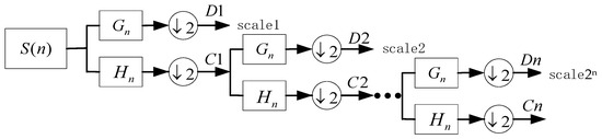 In Figure 1, S(n) is a noisy signal, which can be decomposed into a nearly stationary signal and a noisy signal layer by layer. For example, the first decomposition yields C1 (a nearly stationary signal) and D1 (a noisy signal); C1 continues to decompose according to the accuracy requirements until the requirements are met. In this figure, C1, C2,…, Cn are the low-frequency signals obtained via layer-by-layer decomposition, characterized by low frequency and relative stability, and they contain the main useful signals. D1, D2,…, Dn are high-frequency signals, with relatively few useful signals in this part. The amplitude of the wavelet coefficients in the useful signal part is relatively larger, while the amplitude of the corresponding coefficients of the noise is smaller. Therefore, the threshold method can be used to process the wavelet coefficients: retain the high-amplitude useful signals and filter out the high-frequency, low-amplitude noise signals. The signal reconstruction steps are the reverse of decomposition, as shown in Figure 1. Specifically, Cn − 1 is first reconstructed from Cn and Dn, then Cn − 2 is reconstructed from Cn − 1 and Dn − 1, and finally S(n) is reconstructed from C1 and D1. After signal reconstruction, a reconstructed signal that is close to the real signal can be obtained.