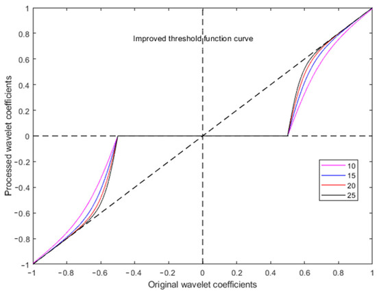 According to Formula (4), the basic idea of semi-soft threshold method is as follows: when is greater than , its processing mode is the same as that of the hard threshold function; when is between and , it approximates the soft threshold function. When , it corresponds to the hard threshold method; when approaches infinity, it corresponds to the soft threshold method. This method is based on the soft and hard threshold methods, and its denoising effect is excellent. However, the determination of the two thresholds is difficult, so it is rarely used in practical applications.