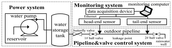 The experimental platform consists of the power system, the pipeline valve control system, and the monitoring system. The power system includes the water pump and the water storage device. The pipeline valve control system includes the testing pipelines, leakage devices, and valves. The monitoring system includes the data acquisition device (Advantech USB-5856, Advantech Co., Ltd., Taipei City, Taiwan Province, China), the infrasound sensor (Model CS-100, The 3rd Research Institute of China Electronics Technology Group Corporation (CETC), Beijing City, China), and the monitoring computer (Inspur NF5280M6, Inspur Electronic Information Industry Co., Ltd., Jinan City, Shandong Province, China). This platform can provide leakage monitoring of the water medium under different pipeline pressures and leakage aperture sizes. Medium flow path: reservoir→water pump (Model ISG100-200, Shanghai Kaiquan Pump Co., Ltd., Shanghai, China)→water storage tank (homemade, 500 L)→butterfly valve (Model D371X-16, Zhejiang Dunan Valve Co., Ltd., Wenzhou, Zhejiang, China)→rubber hose (Food-grade EPDM, Hebei Huafeng Rubber Products Co., Ltd., Cangzhou, Hebei, China)→the 1# ball valve (Model Q41F-16P, Shanghai Huifeng Valve Group Co., Ltd., Shanghai, China)→outdoor pipeline→the 2# ball valve (same as 1# ball valve), as shown in Figure 5.