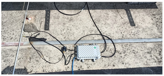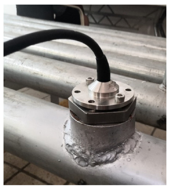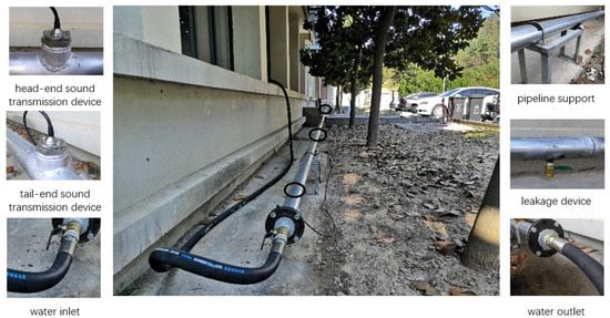 The outdoor pipeline is welded from the DN80 galvanized seamless steel pipe (Shandong Iron and Steel Group Co., Ltd., Jinan, Shandong, China), with a total length of 36 m. The inlet of the outdoor pipeline is connected to the indoor pipeline system through a rubber hose. The outdoor pipeline site is shown in Figure 6. The head-end/tail-end sensors are shown in Figure 7, and the data acquisition device is shown in Figure 8.
