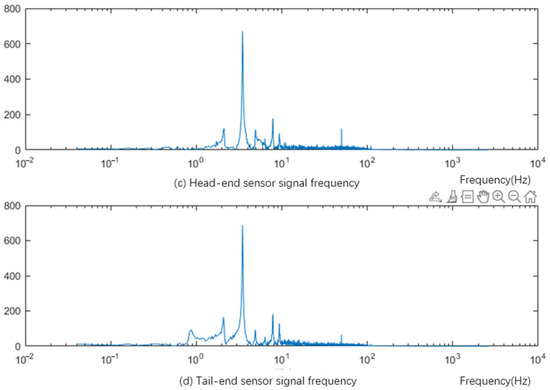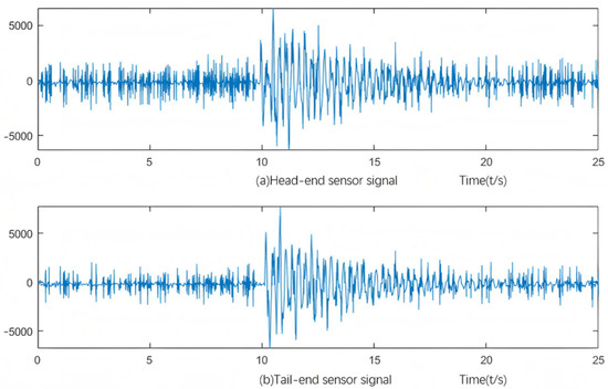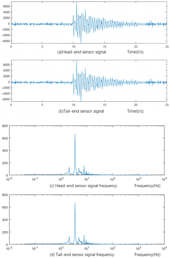 As shown in these figures, the time-domain signal of the head-end sensor is significantly affected by noise and is basically submerged by background noise. The leakage occurs after 10 s, with the signal reaching its maximum amplitude. At the beginning of leakage, the signal amplitude suddenly increases, making it an impulse signal. After the leakage starts, the signal becomes an oscillation signal, and this conforms to the characteristics of the leakage infrasound source.