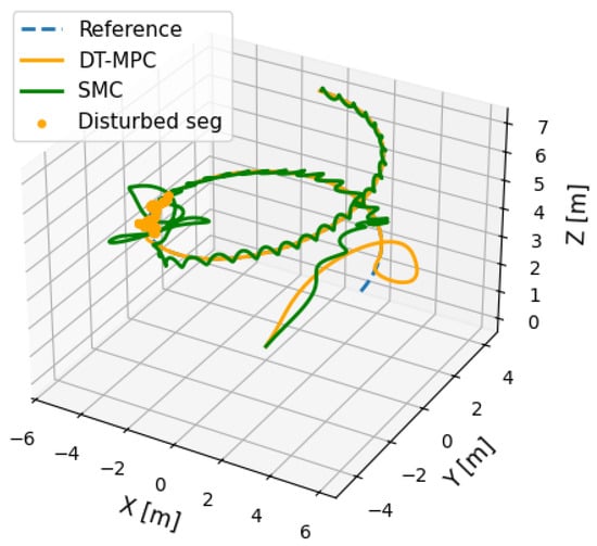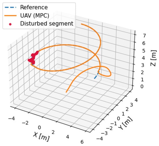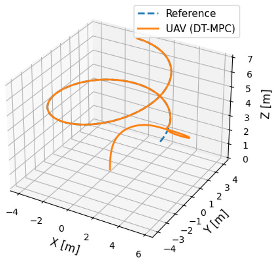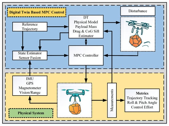 Integrating a DT and MPC provides the UAV controller with a system that can overcome anomalies in the payload [21]. Robust MPC is good in stochastic prediction as it uses uncertainties in optimization [22]. It can support reallocation of payload mass, aerodynamic perturbation, and migration of CoG, enhancing disturbance resilience [23]. DT-supplied foresight allows unrelenting control input refinements, compensating payload perturbations during flight operation and maintaining stability at the expense of energetics [24]. This integration not only solves the problem of irregular payload management, but it brings improvements in efficiency and safety of transportation using UAVs [25].