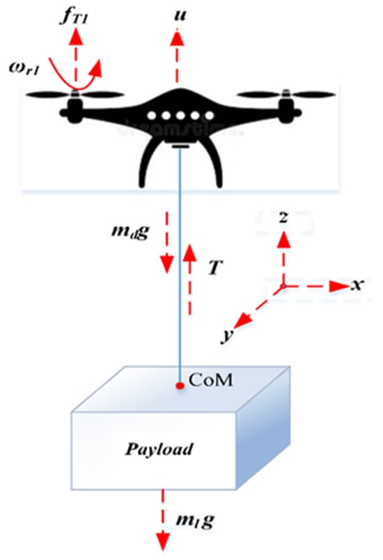 The basic dynamics model captures the UAV–payload interaction as a nonlinear system subject to external disturbances from payload irregularities. Figure 2 presents the schematic diagram of a UAV with a hanging payload.