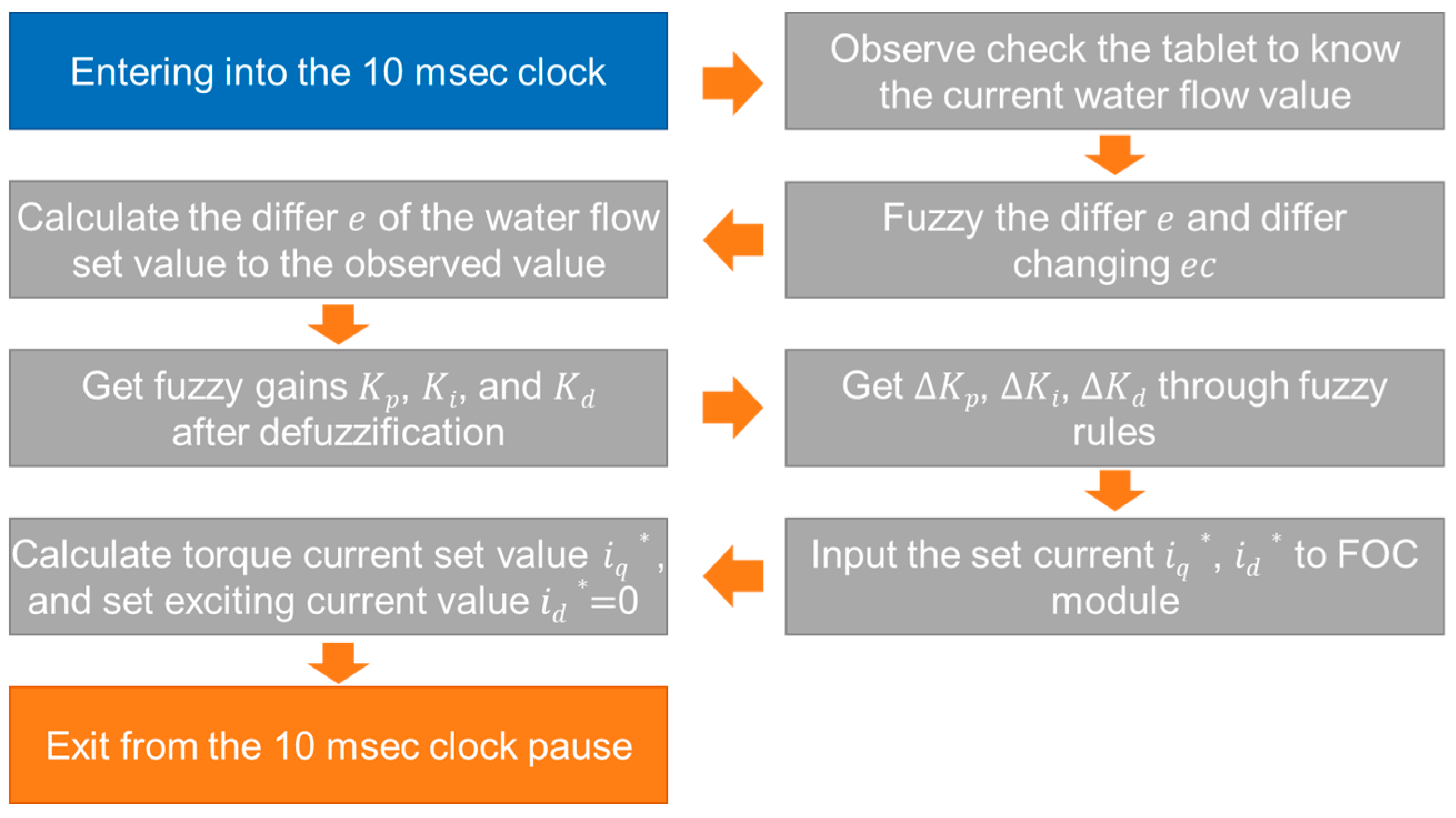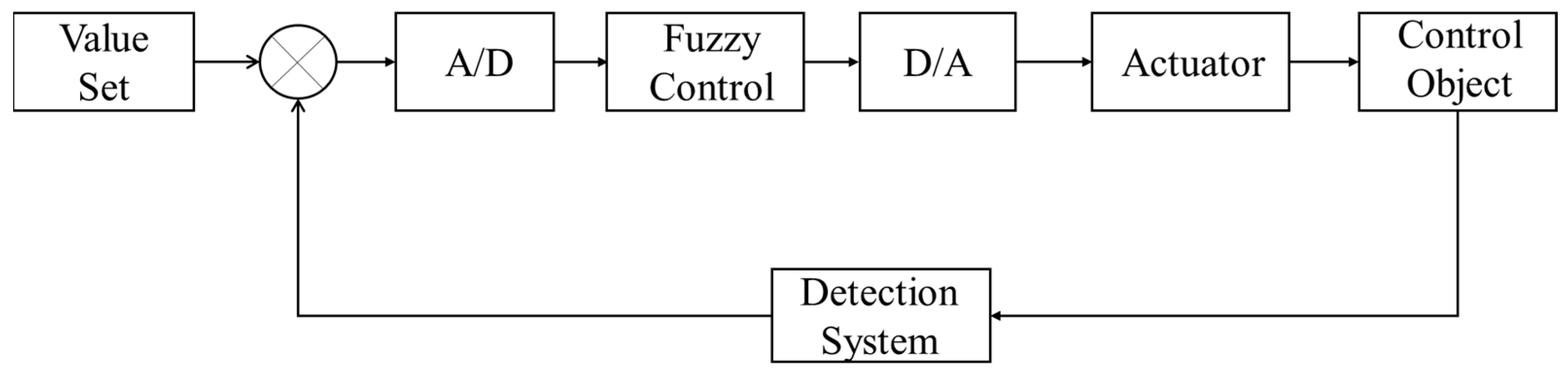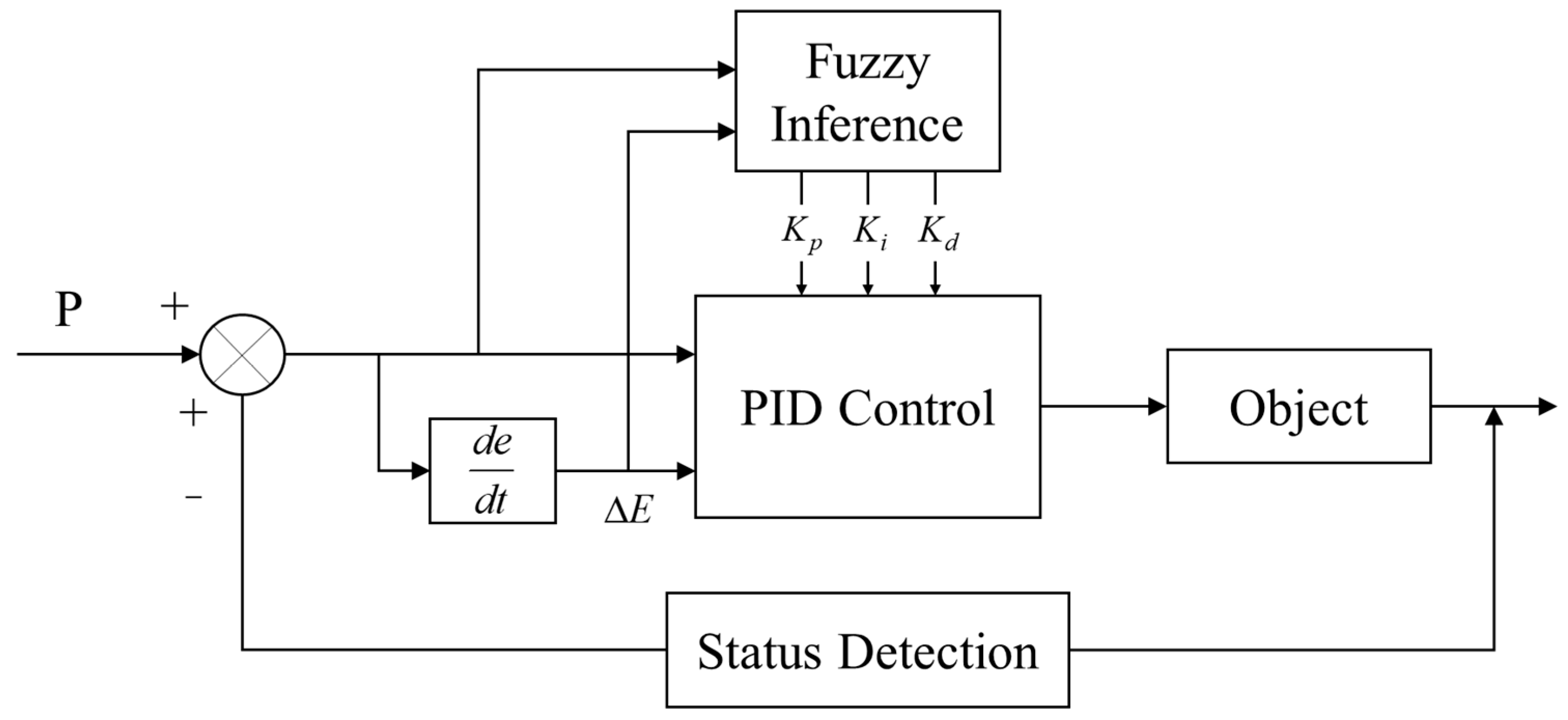 - Input the system’s error and error change rate into the fuzzy logic matrix after Steps (2) and (3) to obtain the modification values of the PID parameters. Finally, the final controller output value, i.e., the system’s control quantity, is calculated through the PID algorithm.