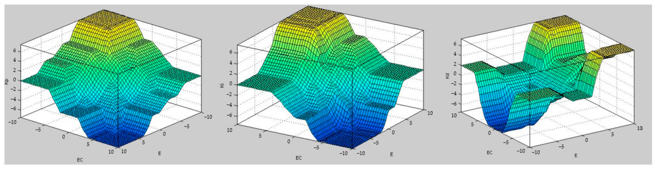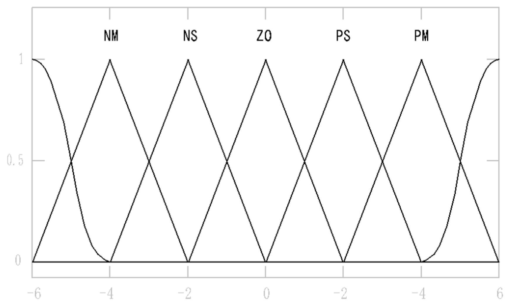 - Determine the structure and type of the fuzzy controller and the corresponding input and output variables. In this paper, error and rate of change of error are selected as the inputs to the controller, and the incremental PID parameters , , and are selected as the output variables.