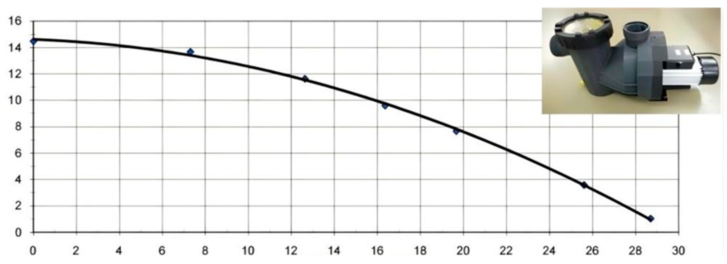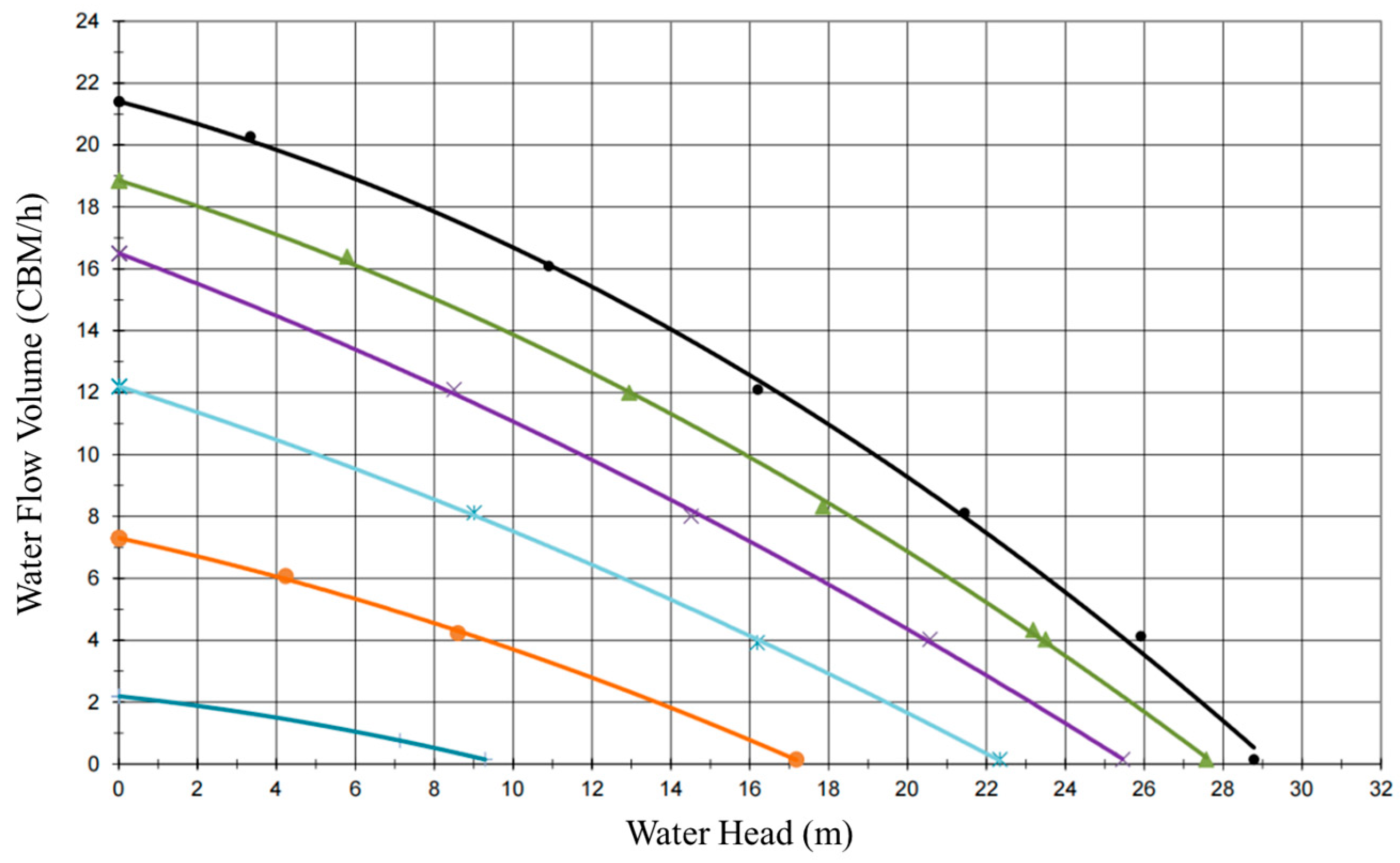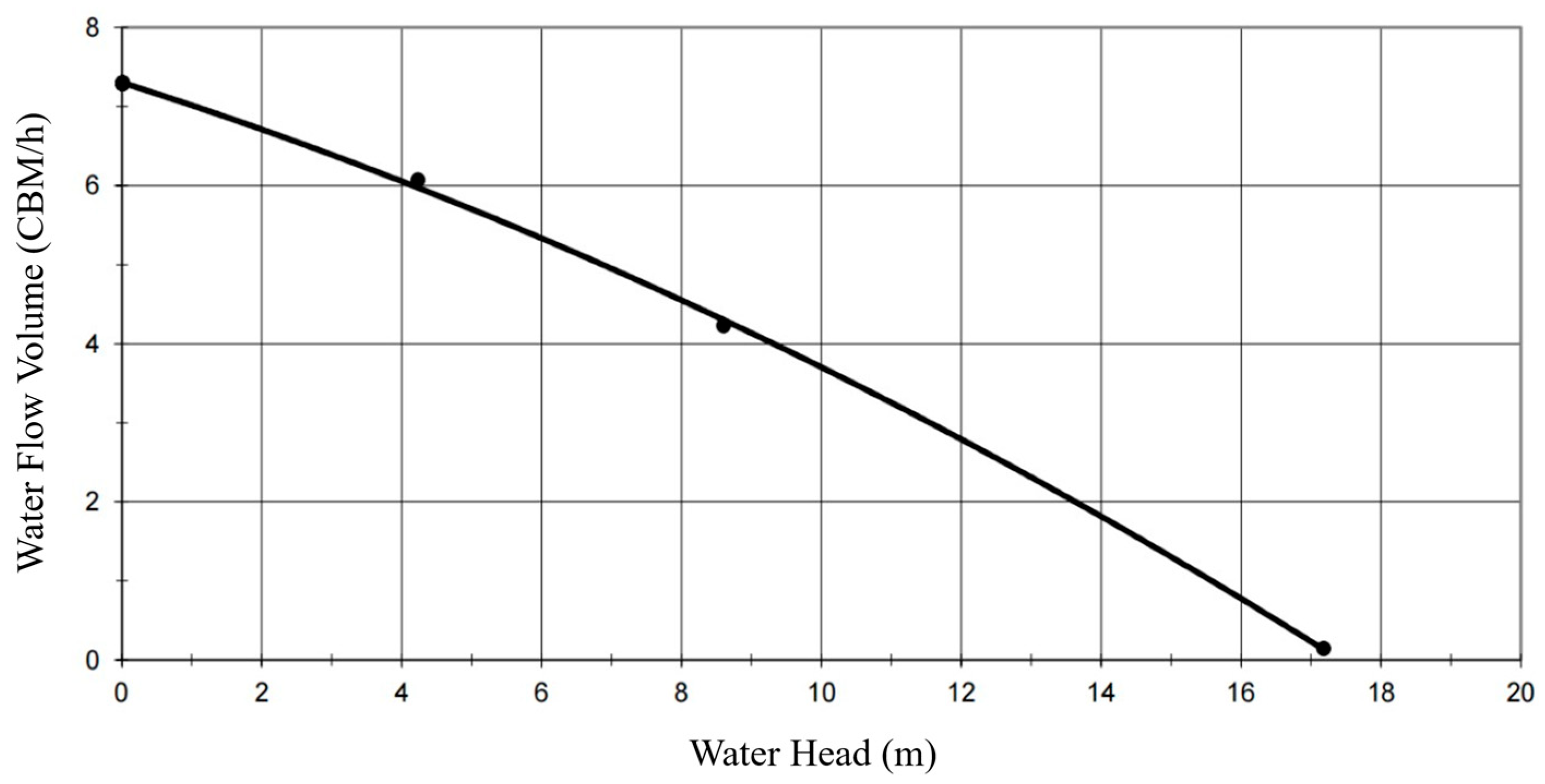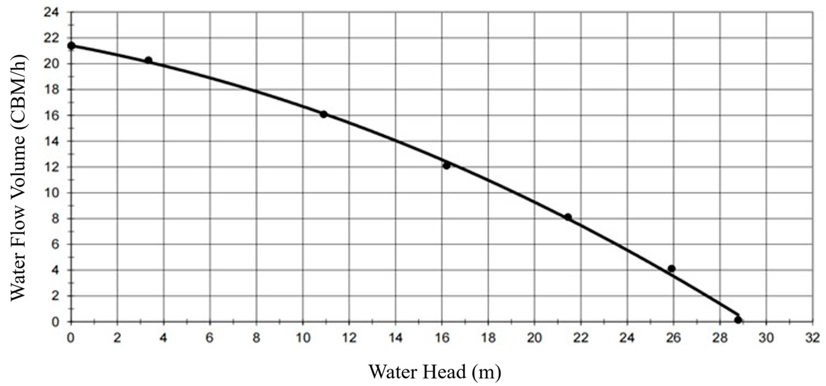 - When the pump system’s input power is a fixed power supply, the pump outputs a constant water flow in a range when the pressure changes. This was verified in the testing: when the motor’s input power was fixed at 100 W, 215 W, 810 W as shown in Figure 21, Figure 22 and Figure 23, the pressure was ignored intentionally in the testing, because in real application, the pressure change would be irregular, so we used a valve to change the water supply pressure, in the same way as a normal water supply’s valve control.