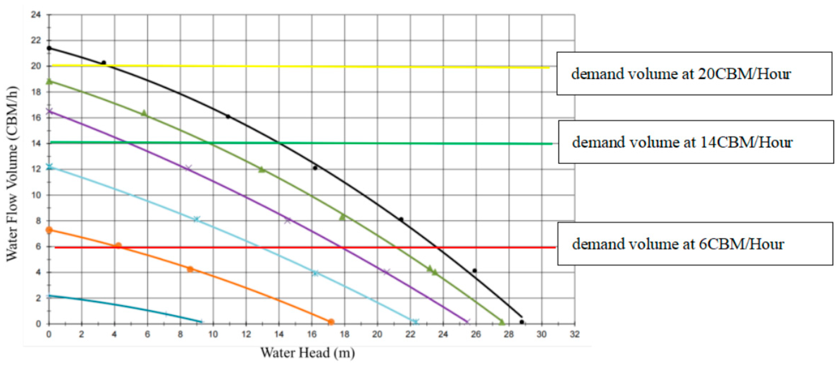 - Luo, Y.; Xiong, Z.; Sun, H.; Guo, Y. Research on energy-saving operation control model of the multi-type configuration centrifugal pump system with single invert. Adv. Mech. Eng. 2017, 9, 1687814017707650. [Google Scholar] [CrossRef]