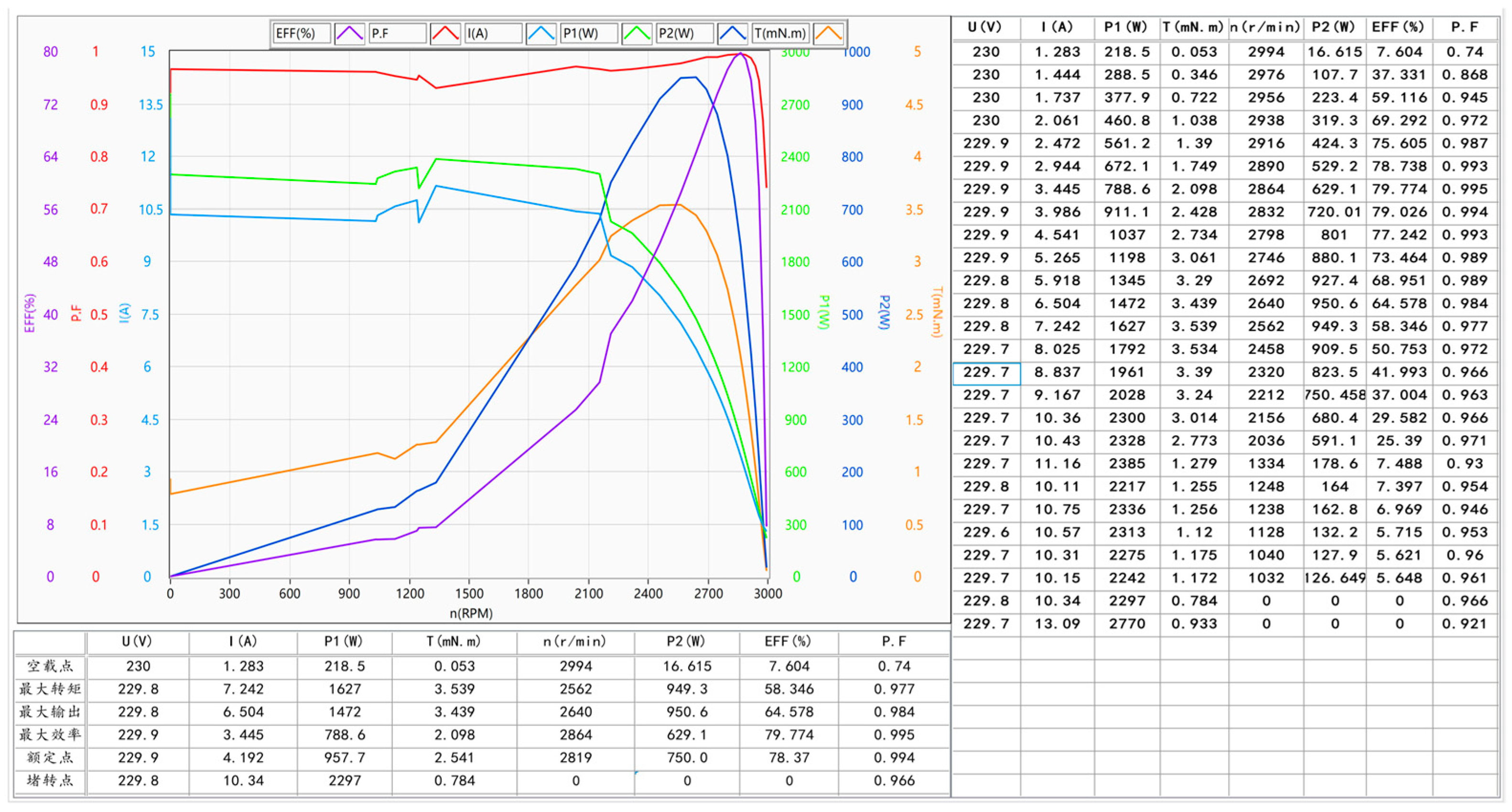 | Loading Rated | Motor Output Power [W] | Motor Input Power [W] | Current [A] | Torque [N·m] | Power Factor | N (rpm) | Efficiency |