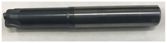In this study, a four-flute solid end mill (TEFF100N4-040/30C10R16M, Tungaloy Corporation, Iwaki, Japan) for low depth of cut and high feed rate with a ball radius in the center of the cutting edge and a corner radius on the periphery was used. The tool was coated with a TiAlN layer accumulated by the PVD method. The overall view of the tool is shown in Figure 2, and the examples of aspects of the flank face and the rake face observed using an optical microscope are shown in Figure 3 and Figure 4, respectively (see Section 2.5). The tool specifications are shown in Table 2.