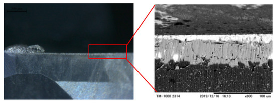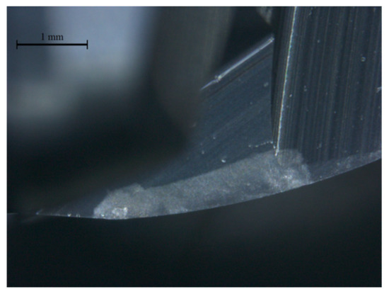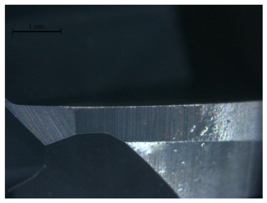 The optical microscope was used to observe the flank face and rake face to measure the flank wear width and to check for the presence of chipping on the cutting edge. In this study, an observation was made from the flank face or rake face, and the experimental milling was terminated when chipping or defects with a width of 0.2 mm or more were observed on any one of the four cutting edges, as milling could not be continued. An example of chipping observation is shown in Figure 6. The area within 500 μm from the boundary of the outer circumference of the cutting edge on the flank face was observed using an optical microscope, and the experimental milling was terminated when the wear width reached 0.1 mm.