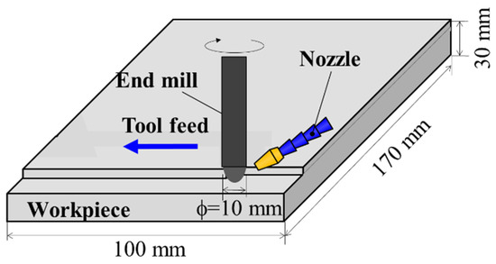 As shown in Figure 1, an NC (Numerical Control) milling machine (FMB-400, Okuma & Howa Machinery Ltd., Kohnan, Japan) with a maximum spindle speed of 4000 rpm was used in experimental milling, and Inconel 718 superalloy was fixed to a vise on the table of the NC milling machine with a solid carbide end mill [22]. Several cutting speeds and feed rates in milling, and tool observations were made on the rake face and flank face. The tool life is defined as the occurrence of chipping on the tool based on experiences in this study [23], and the experimental milling is terminated when one of the following conditions occurs: (1) tool life is reached, (2) the maximum tool wear exceeds 0.1 mm or (3) the cutting length reaches 10 m. The tool life, tool wear, coating damage, amount of welding and surface roughness are mainly evaluated in this study. The used cutting fluid was Surecut CA-15 (Yanase SEIYU Co., Ltd., Osaka, Japan). Table 1 shows the cutting oil specifications.