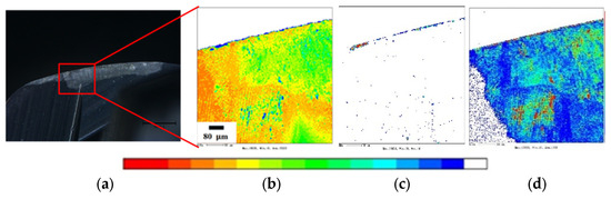 The analyzed results of the Al also show that the coating damage width increases as the feed rate is increased. The contact area with the rake face is increased by increasing the feed rate, because the cutting tip is larger in the milling process. It is considered that the larger the feed rate, the cleaner the cutting edge ridge is maintained because the chips collide with the rake face mid-section. In fact, the analyzed results of W in Figure 12 and Figure 15 show that a number of welded lumps of the material components of the workpiece, indicated in white, can be observed near the cutting edge ridge in C (51.65, 0.08), D (82.64, 0.05) and J (82.64, 0.08), but almost none in I (51.65, 0.2).