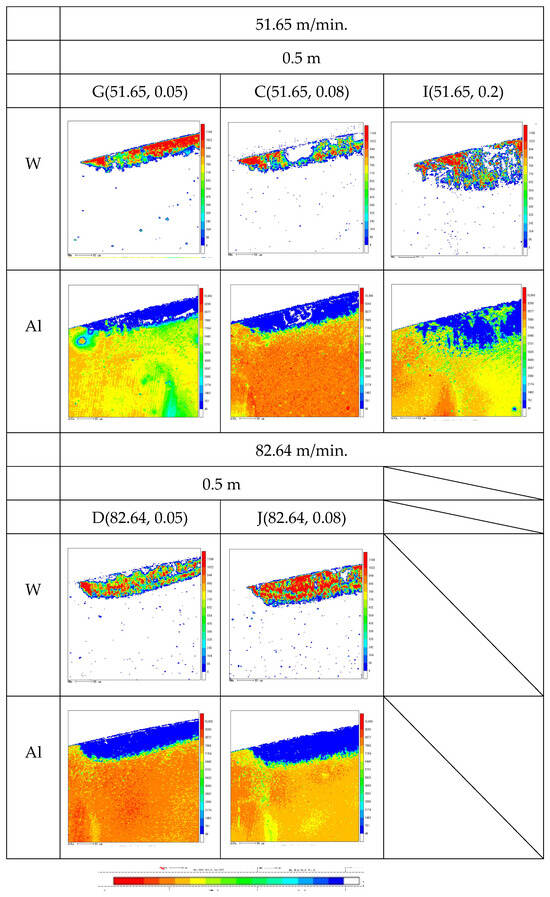 The analyzed results of the Al in Figure 12 show that damage to the coating film can be confirmed for all conditions except I (51.65, 0.2) at the cutting length of 0.5 m, which remains unchanged at the end of tool life in Figure 13. However, for I (51.65, 0.2), the coating damage was partial at the cutting length of 0.5 m, but the damage spread as the cutting length increased. This suggests that under low feed rate conditions, the coating film is completely lost after a small cutting length, but increasing the feed rate can extend the life of the coating film.