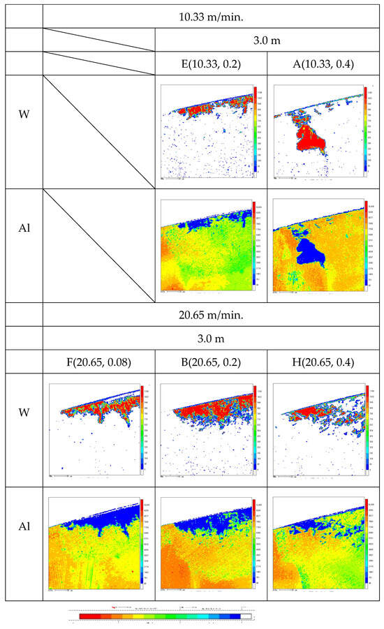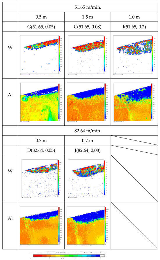 EPMA was used to compare the damage state of the tool coating film of the rake face and the change in welding of the material components of the workpiece in high-speed milling. The analyzed elements were tungsten W (the base metal of the cemented carbide tool), aluminum Al (the coating film) and nickel Ni (the main component of the workpiece). The analyzed results at a cutting length of 0.5 m are shown in Figure 12 and Figure 14, respectively, and the analyzed results at the cutting length at tool life are shown in Figure 13 and Figure 15, respectively. As the condition G (51.65, 0.05) resulted in tool life at the cutting length of 0.5 m, Figure 12 shows the same analyzed results corresponding to Figure 13. Figure 14 shows the same analyzed results corresponding to Figure 15.