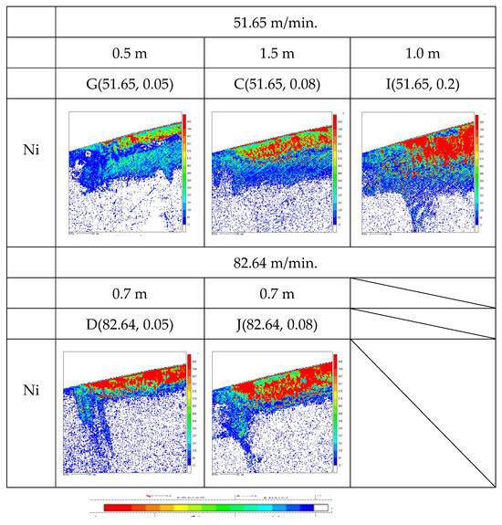 Comparing C (51.65, 0.08), D (82.64, 0.05) and J (82.64, 0.08) from the analyzed results of Ni in Figure 14 and Figure 15, it can be seen that there are areas where the Ni welding decreases as the cutting length increases. This suggests that the welding is detached during the milling process. On the other hand, for I (51.65, 0.2), the area of Ni welding increases monotonically with increasing cutting length. Increasing the feed rate up to 0.2 mm/tooth suppresses the welding delamination to some extent, but at 0.05 mm/tooth and 0.08 mm/tooth, there is no significant difference, indicating that the welding delamination progresses.