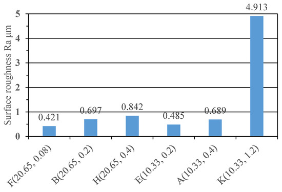 The compared results of the surface roughness of the workpiece in low-speed milling (10.33 m/min and 20.65 m/min) are shown in Figure 18. The compared results in terms of cutting speeds of 10.33 m/min and 20.65 m/min show that, as in high-speed milling, the surface roughness of the workpiece increases with increasing feed rate at the same cutting speed. In particular, K (10.33, 1.2) has a feed rate three times higher than A (10.33, 0.4), but the surface roughness of the workpiece is approximately seven times larger. Compared results from the perspective of feed rates of 0.2 mm/tooth and 0.4 mm/tooth show that at the same feed rate, the surface roughness of the workpiece increases as the cutting speed increases.