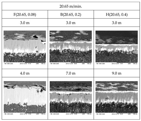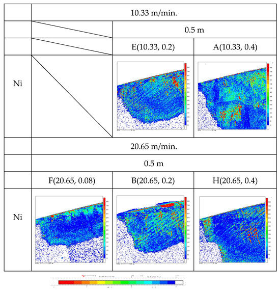 In Figure 12, significant coating damage was shown in all conditions at a cutting length of 0.5 m in high-speed milling. On the other hand, Figure 19 showed that relatively little coating damage occurred in low-speed milling. However, it can be seen that the amount of damage varied significantly depending on the conditions: in terms of cutting speeds of 51.65 m/min and 82.64 m/min, the coating film damage became smaller as the feed rate increased. Compared results with Figure 20 also showed that the speed of coating film damage varies depending on the conditions. Specifically, there is no significant difference in coating film damage at E (10.33, 0.2) and B (20.65, 0.2) in Figure 19, while coating film damage spread significantly at B (20.65, 0.2) in Figure 20.