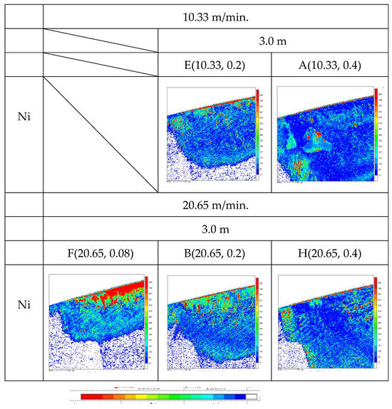From Figure 20, it can be inferred that a constituent cutting edge exists along the cutting edge ridge in F (20.65, 0.08) because there is a long and narrow area along the cutting edge ridge that is not detected as W in the W analysis image, and this area is detected as a fully welded area in the analyzed Ni image in Figure 22 at (20.65, 0.08), which showed a large growth of flank wear and tool life at a cutting length of 4.0 m, suggesting that the resumption of cutting accelerated the welding of the constituent cutting edges on the edge ridge and increased flank wear. In B (20.65, 0.2), clear Ni welding was observed on the cutting edge ridge at a cutting length of 0.5 m, and coating damage spread relatively large, at a cutting length of 3.0 m. This suggests that welding tended to occur on the cutting edge ridge, leading to repeated welding formation and drop-out, and eventually to chipping. It can be inferred that welding tends to occur on the blade edge ridge, leading to repeated welding and dropout, and finally to chipping. On the other hand, checking H (20.65, 0.4), E (10.33, 0.2) and A (10.33, 0.4) in Figure 22, Ni welding was only slightly present along the cutting edge ridge at a cutting length of 3.0 m, indicating that welding could be suppressed.