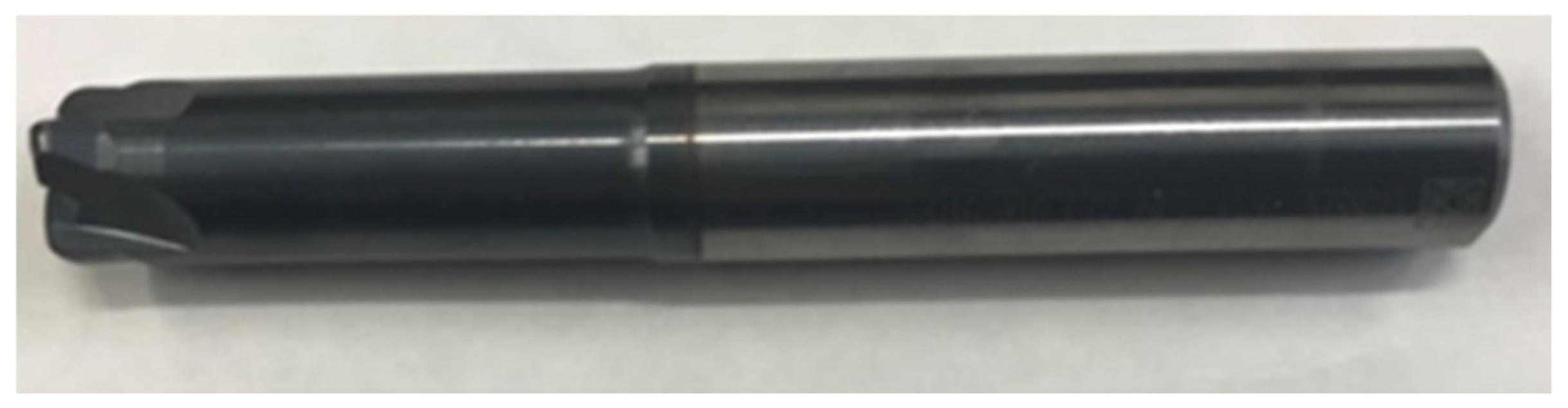 In this study, a four-flute solid end mill (TEFF100N4-040/30C10R16M, Tungaloy Corporation, Iwaki, Japan) for low depth of cut and high feed rate with a ball radius in the center of the cutting edge and a corner radius on the periphery was used. The tool was coated with a TiAlN layer accumulated by the PVD method. The overall view of the tool is shown in