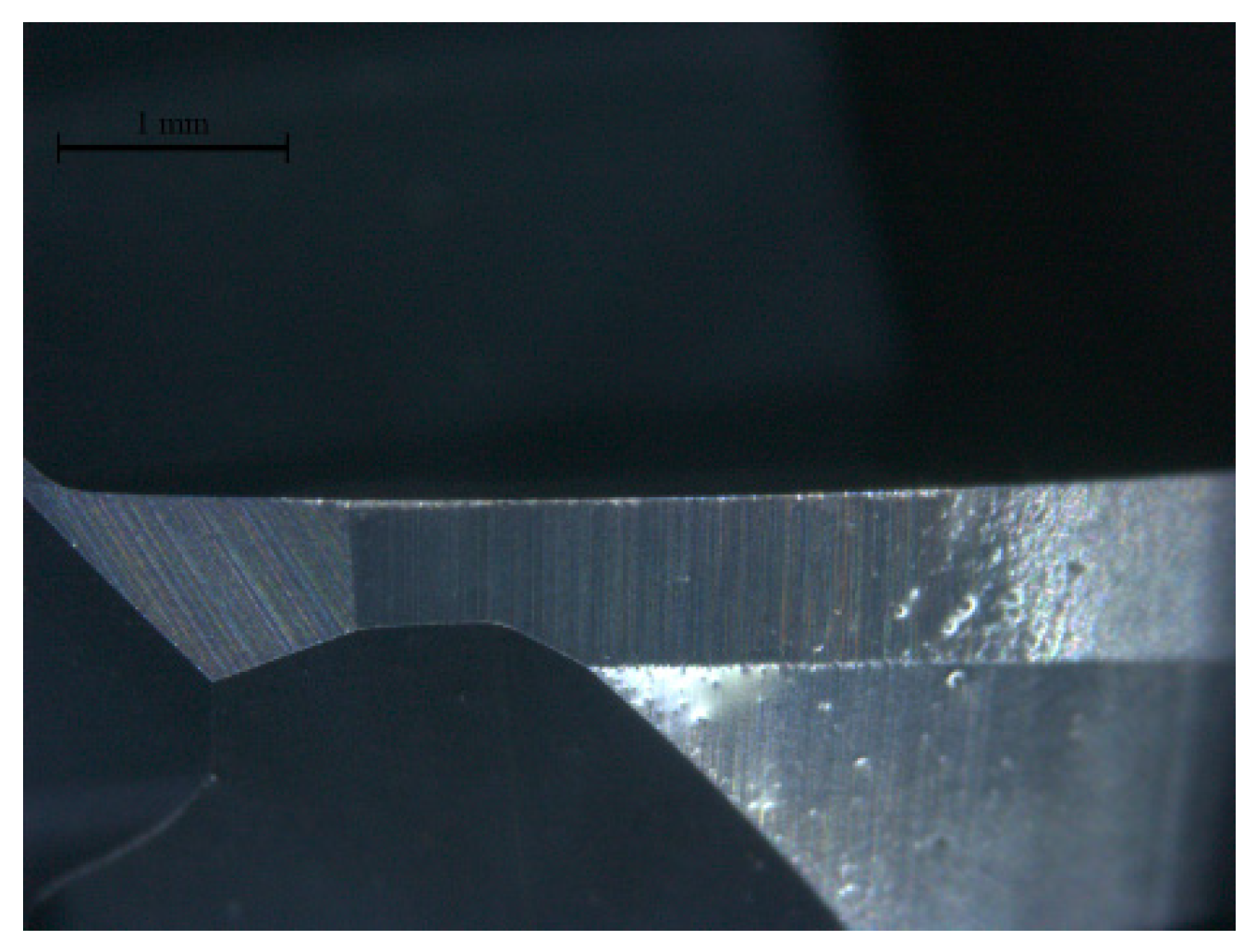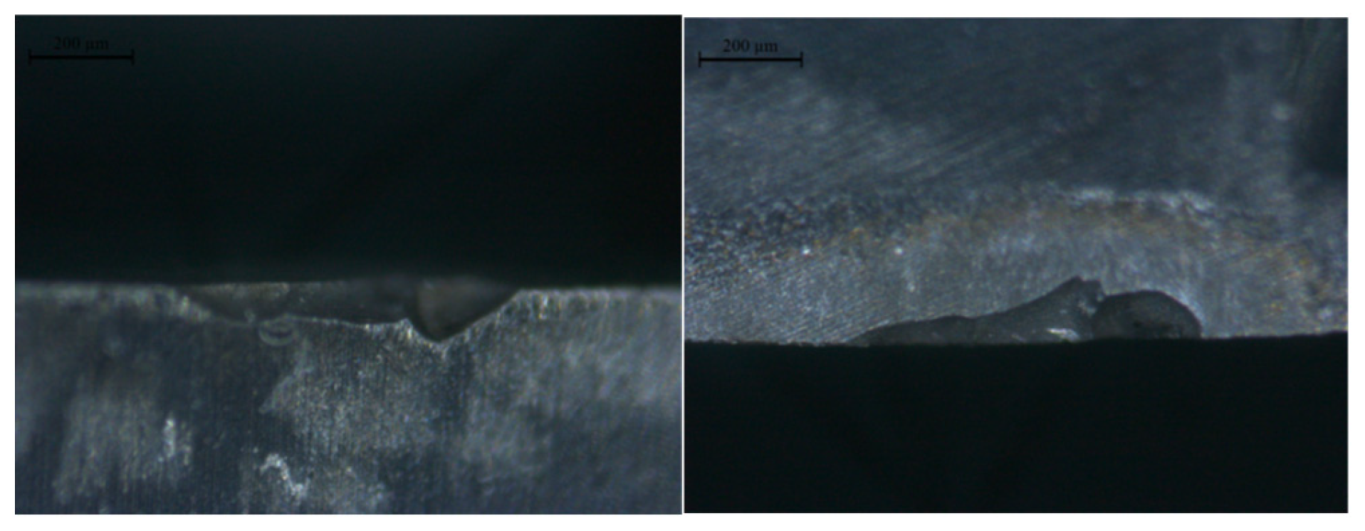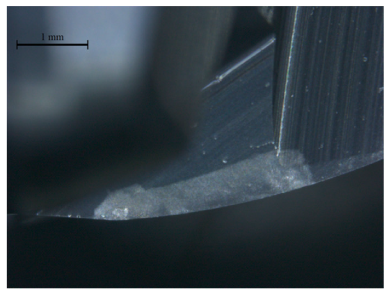 The optical microscope was used to observe the flank face and rake face to measure the flank wear width and to check for the presence of chipping on the cutting edge. In this study, an observation was made from the flank face or rake face, and the experimental milling was terminated when chipping or defects with a width of 0.2 mm or more were observed on any one of the four cutting edges, as milling could not be continued. An example of chipping observation is shown in