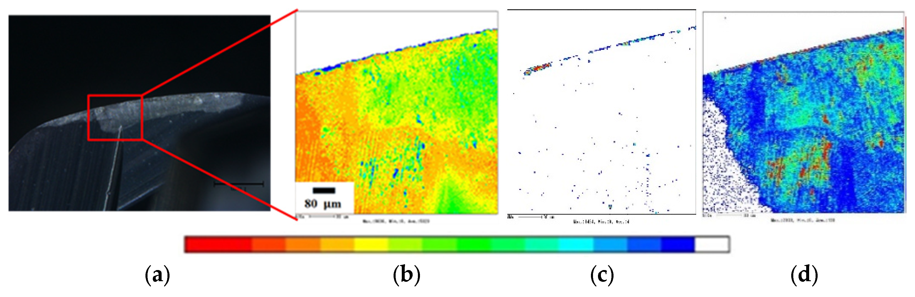 4.3. Coating Film Damage and Changes in Welding of Workpiece Components in Low-Speed Milling Experiments