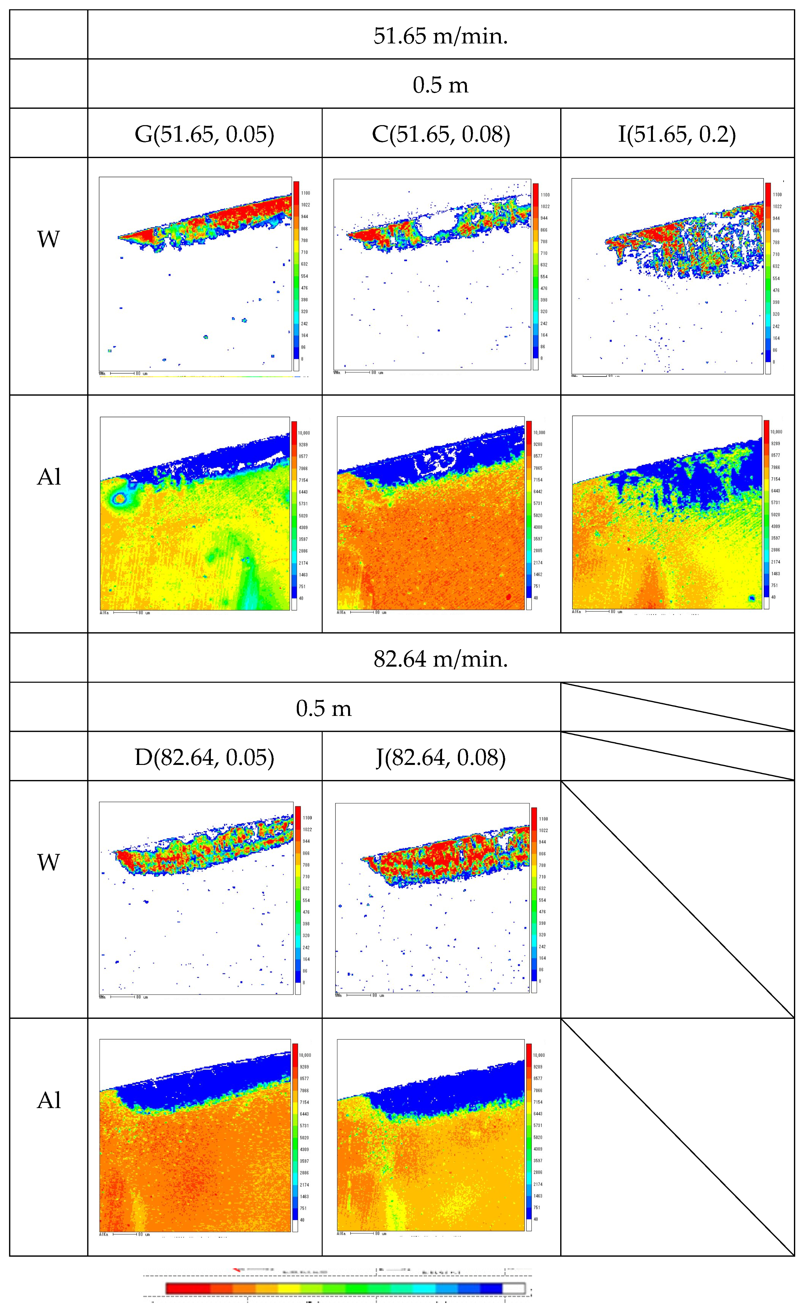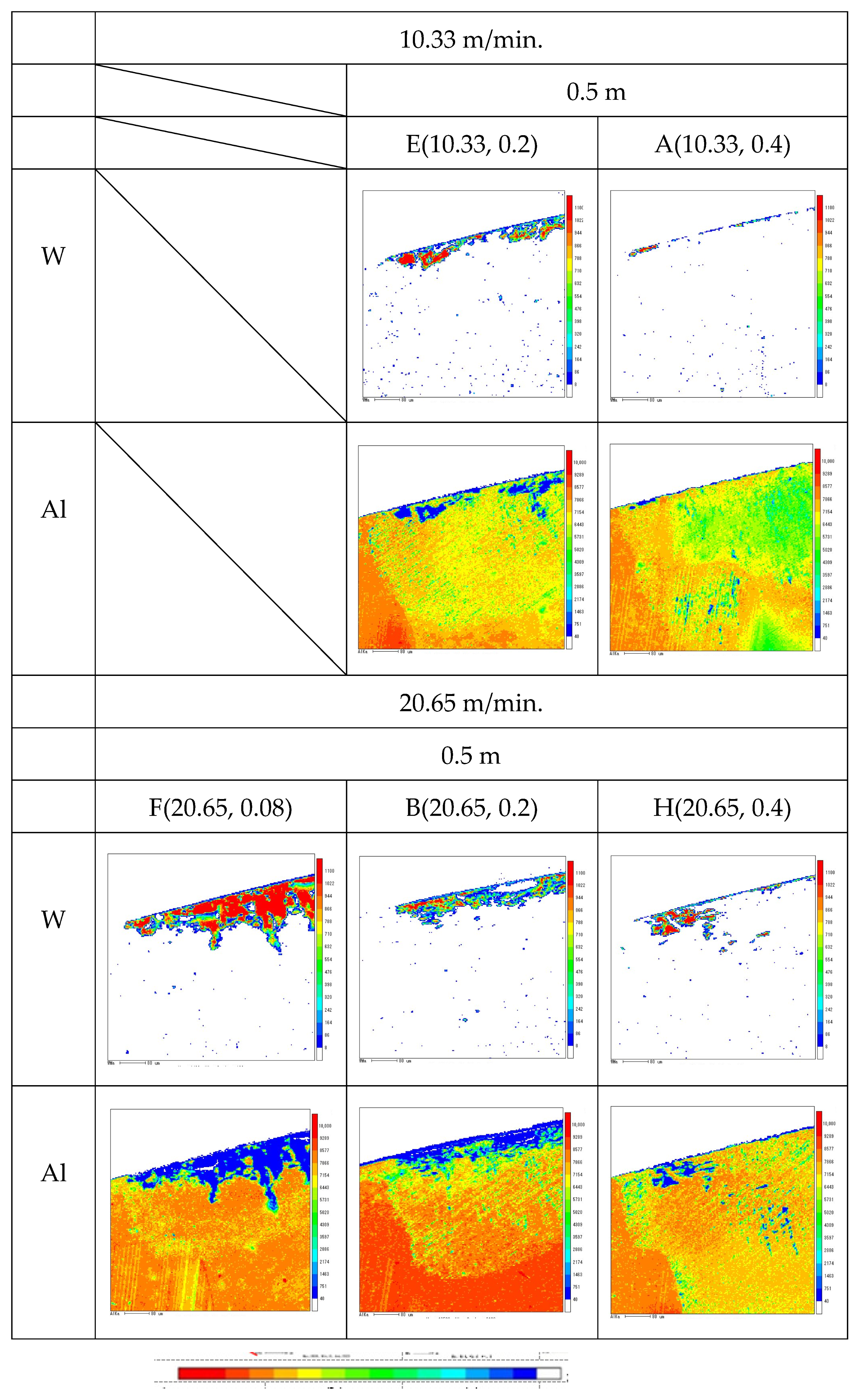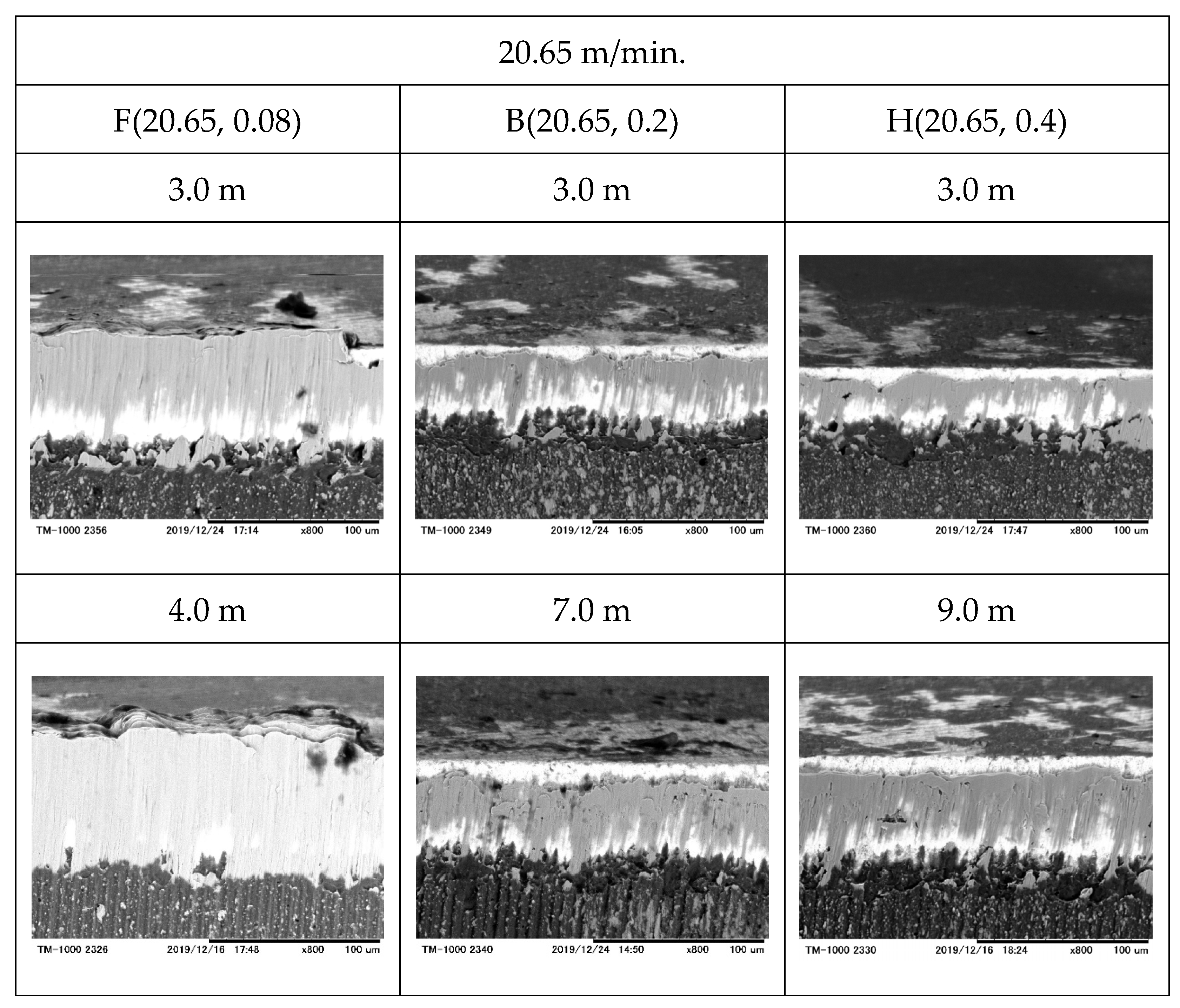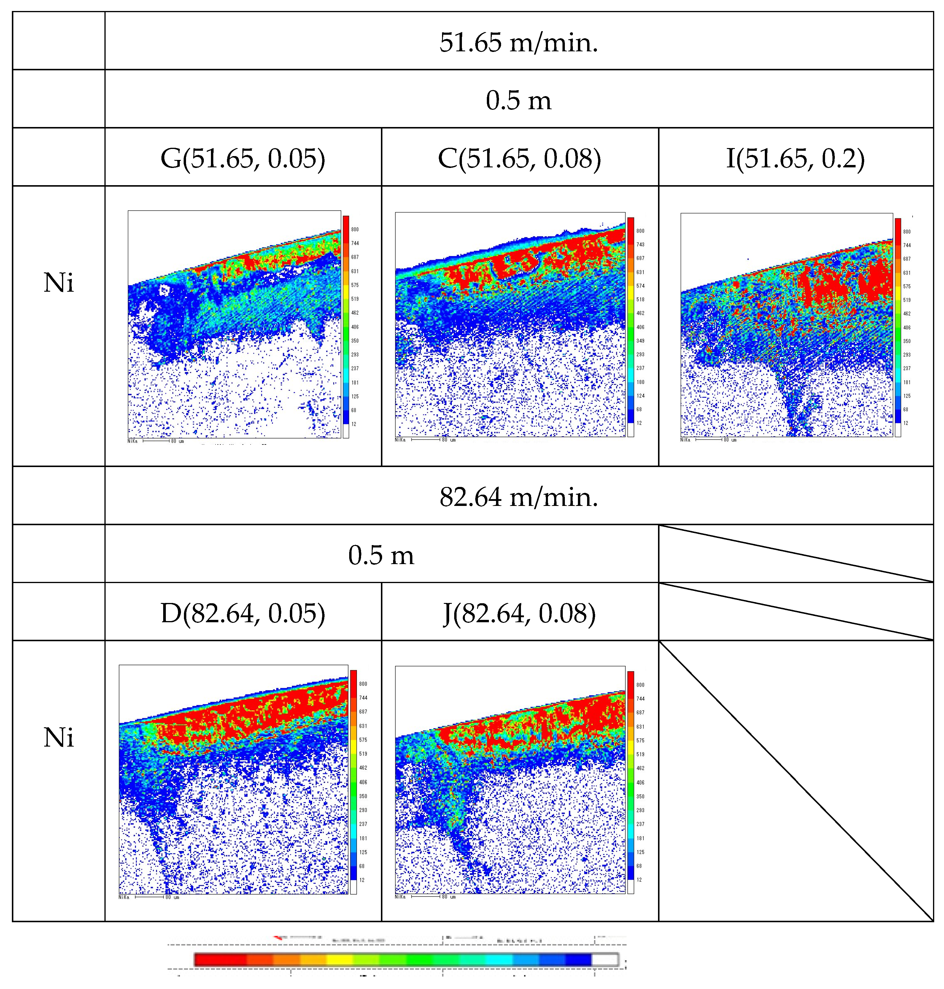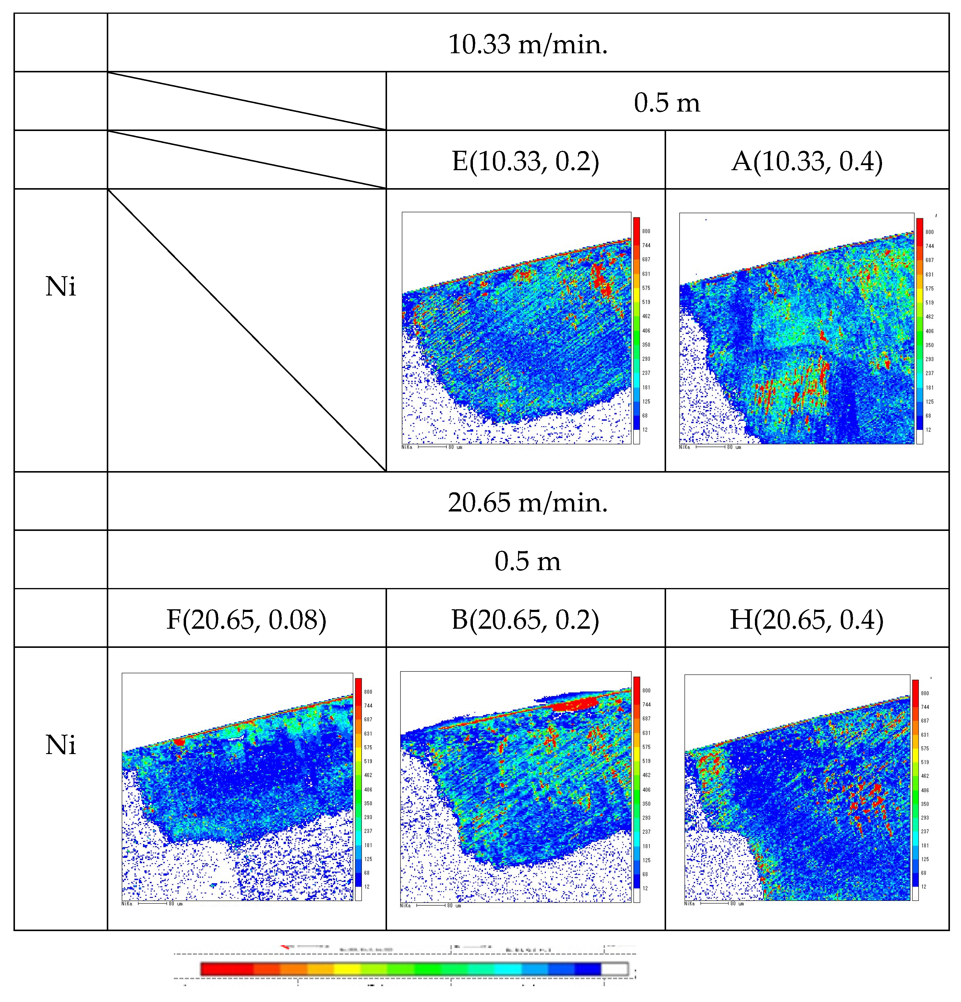 Figure 23, A (10.33, 0.4) shows that at a cutting length of 10 m, the Ni width was larger than at a cutting length of 3.0 m and reached the boundary with the coating film. On the other hand, for B (20.65, 0.2) and H (20.65, 0.4) in