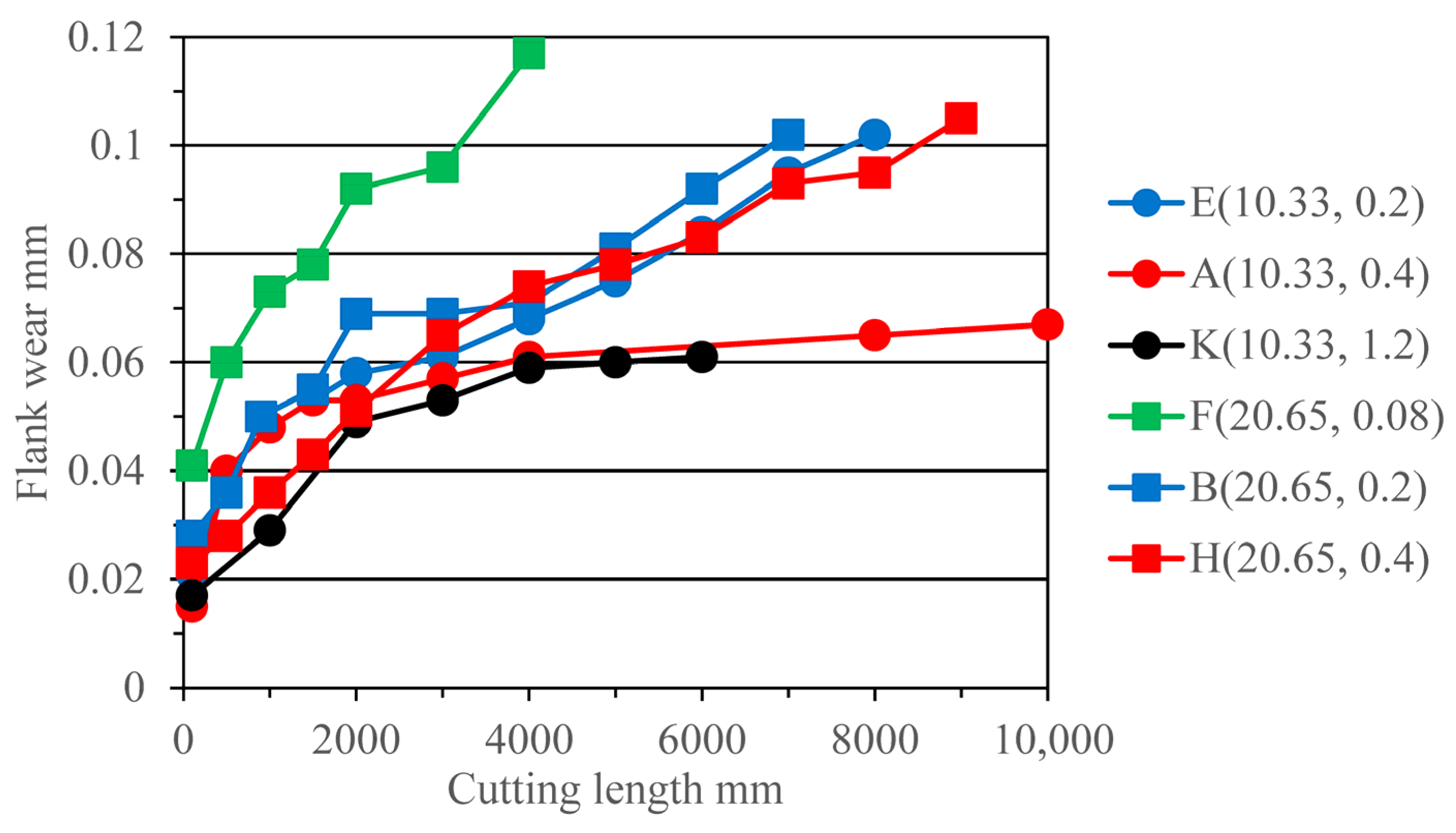 Figure 17 shows the relationship between cutting length and flank wear width in low-speed milling (10.33 m/min, 20.65 m/min). Compared with the high-speed milling, the results showed no overall difference. Compared with a cutting speed of 20.65 m/min, the wear width at the initial stage of milling was larger for F (20.65, 0.08) with a cutting speed of 0.08 mm/tooth than for B (20.65, 0.2) and H (20.65, 0.4) with higher feed rates, and the subsequent wear rate was also larger and the flank wear progressed relatively rapidly. Compared with a cutting speed of 10.33 m/min, the flank wear progresses linearly with increasing cutting length for E (10.33, 0.2). On the other hand, for K (10.33, 1.2), the flank wear progressed gently up to a cutting length of around 4.0 m, after which the flank wear progressed rapidly and chipping occurred at 6.0 m, which was the end of tool life. It is presumed that the high cutting resistance due to the extremely high feed rate caused the tool cutting edge to drop off, resulting in rapid flank wear and ultimately chipping. In terms of the feed rate of 0.2 mm/tooth and 0.4 mm/tooth, the flank wear progression was almost the same when the feed rate was equal. However, the flank wear progressed almost linearly after a cutting length of 4.0 m for H (20.65, 0.4), while for A (10.33, 0.4), the tool wear progressed rapidly and gently from around a cutting length of 4.0 m, reaching a cutting length of 10 m as it was.