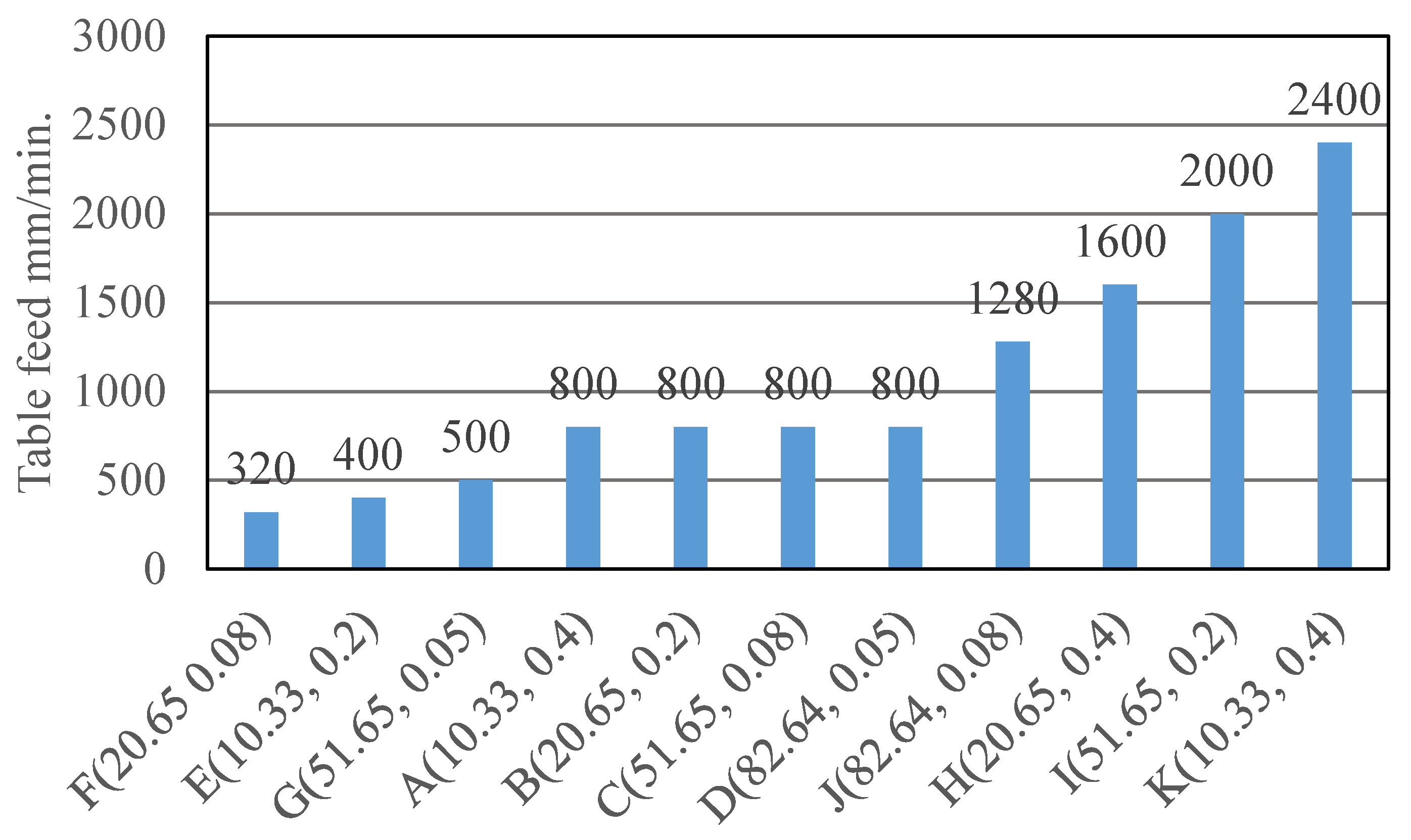 More efficient milling can be expected for J (82.64, 0.08), H (20.65, 0.4), I (51.65, 0.2) and K (10.33, 1.2) compared with A (10.33, 0.4). However, J (82.64, 0.08) and I (51.65, 0.2) in high-speed milling, as well as C (51.65, 0.08) and D (82.64, 0.05), show shorter tool life due to welding of the material components of the workpiece. On the other hand, H (20.65, 0.4) causes faster flank wear than A (10.33, 0.4), but doubles the milling efficiency to 1600 mm/min. However, this is not a good condition because the high impact on the tool cutting edge due to the high feed rate causes damage to the cutting edge, and the surface roughness of the workpiece is approximately nine times higher than that of A (10.33, 0.4).