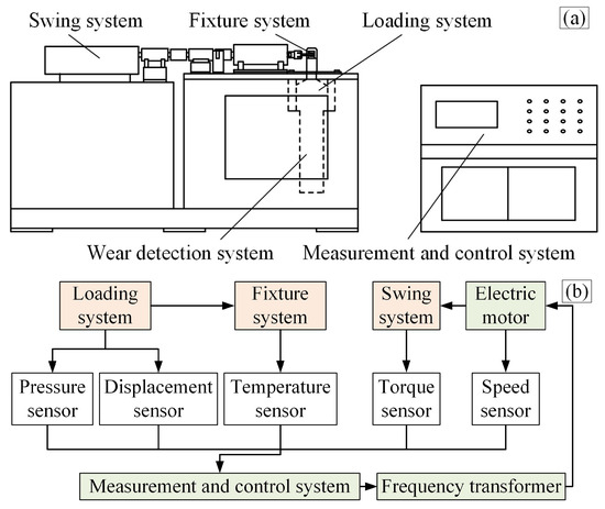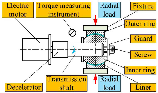 The dynamic detection of the starting torque of the SSPBs was carried out in the laboratory on a high-frequency swing friction and wear tester for the SSPBs. The tester mainly includes a swing system, loading system, fixture system, control system, and so on, and the overall layout of the tester is shown in Figure 3a. Its loading force range is 0–3000 N, with a maximum swing frequency of 35 Hz and a maximum swing angle of 5°, and the detection accuracy of the starting torque is 0.5% FS. The radial loading of the bearing can be realized by the tester, and its motion form can be controlled. At the same time, the friction torque of the bearing, the temperature, and the change in the wear amount of the friction surface can be monitored in real time during the bearing swing.