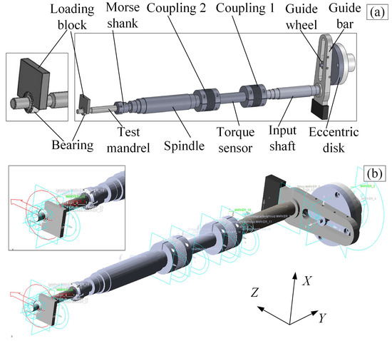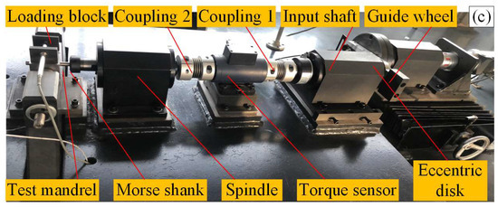 The main structure of the swing system of the tester is shown in Figure 3c. The swing system has a swing angle of ±4°, and it mainly consists of an eccentric disk, guide bar, input shaft, coupling, torque sensor, spindle, guide wheel, morse shank, loading block, and test mandrel [2]. The inner ring of the bearing is assembled to the test mandrel via an interference fit, and the outer ring is clamped by the loading block. During the test, the test mandrel performs reciprocating oscillatory motion, and then the inner ring of the bearing is driven to swing.