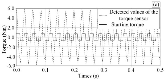 The solver within the own system of the Adams 2012 software was employed to solve the simulation results of the swing system, yielding the curves shown in Figure 5. The variation curves of the detection values of the torque sensor and the starting torque are shown in Figure 5a. When the swinging mechanism of the swing system swings back and forth between the two limit positions, the movement of the mechanism is accelerated and then decelerated. Due to the existence of the inertia torque, the detection values of the torque sensor are greater than those for the starting torque during the acceleration of the swing system. However, during the deceleration of the swing system, the detected values of the torque sensor are less than those for the starting torque.