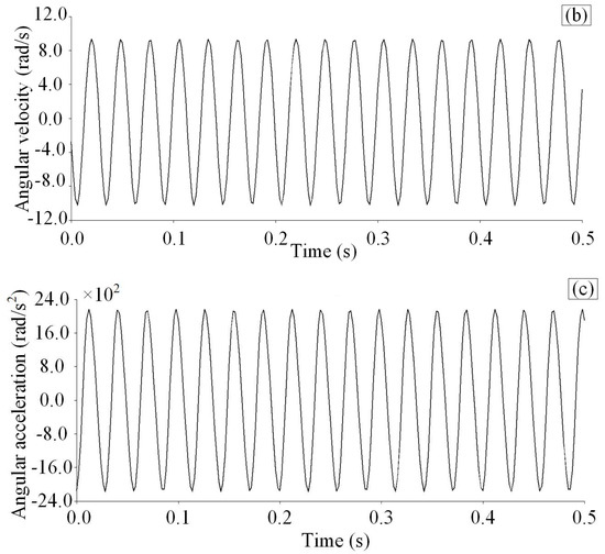 As shown in Figure 5b,c, the angular velocity and angular acceleration curves of the spindle of the swing system are obtained by setting the same parameters as in Figure 5a. It can be seen that the maximum angular velocity of the spindle is equal to 9.3578 rad/s and the maximum angular acceleration is equal to 2170.5367 rad/s2.