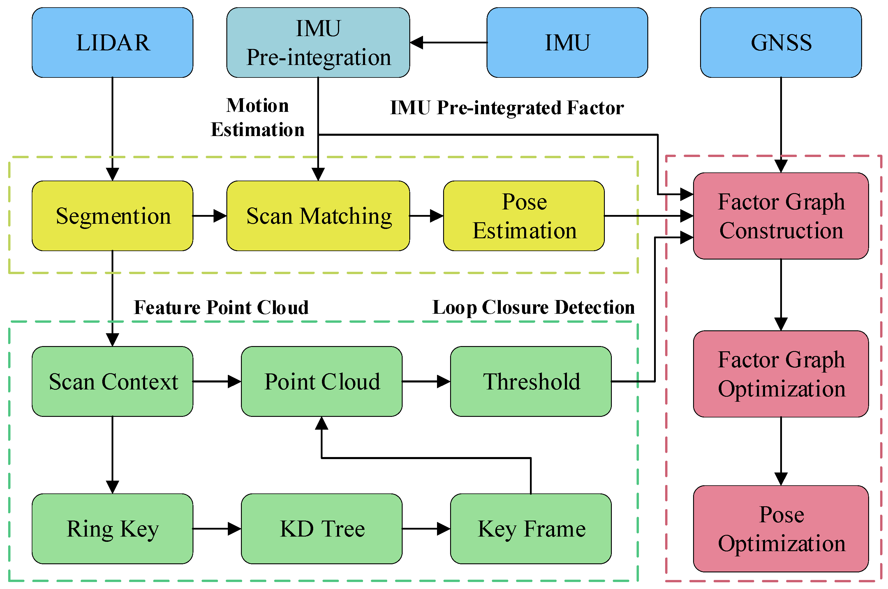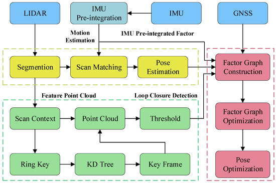 Figure 2, comprises four major modules: the GNSS module, the Inertial Measurement Unit (IMU) module, the loop-closure detection module, and the LiDAR odometry module. Firstly, the IMU compensates for the motion distortion of the point clouds and provides the initial pose estimation for the LiDAR odometry. Thereafter, the LiDAR odometry matches the feature point clouds of the current frame with the submap. Then, by utilizing scan-context [