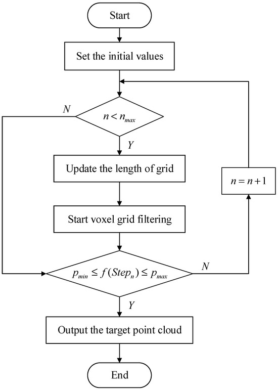 , the length of voxel grid will be adapted according to Equations (27) and (28) and be substituted into the self-adaptive voxel filter again. Repeat the previous step until