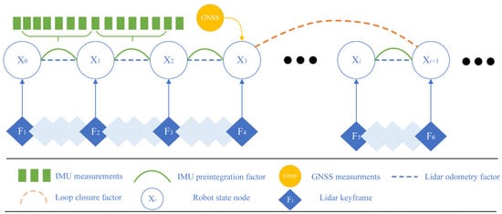 35]. The IMU pre-integration factor, the LiDAR odometer factor, the GNSS factor, and the loop closure factor are inserted into the global factor graph, and finally, global graph optimization is updated by the Bayes tree [