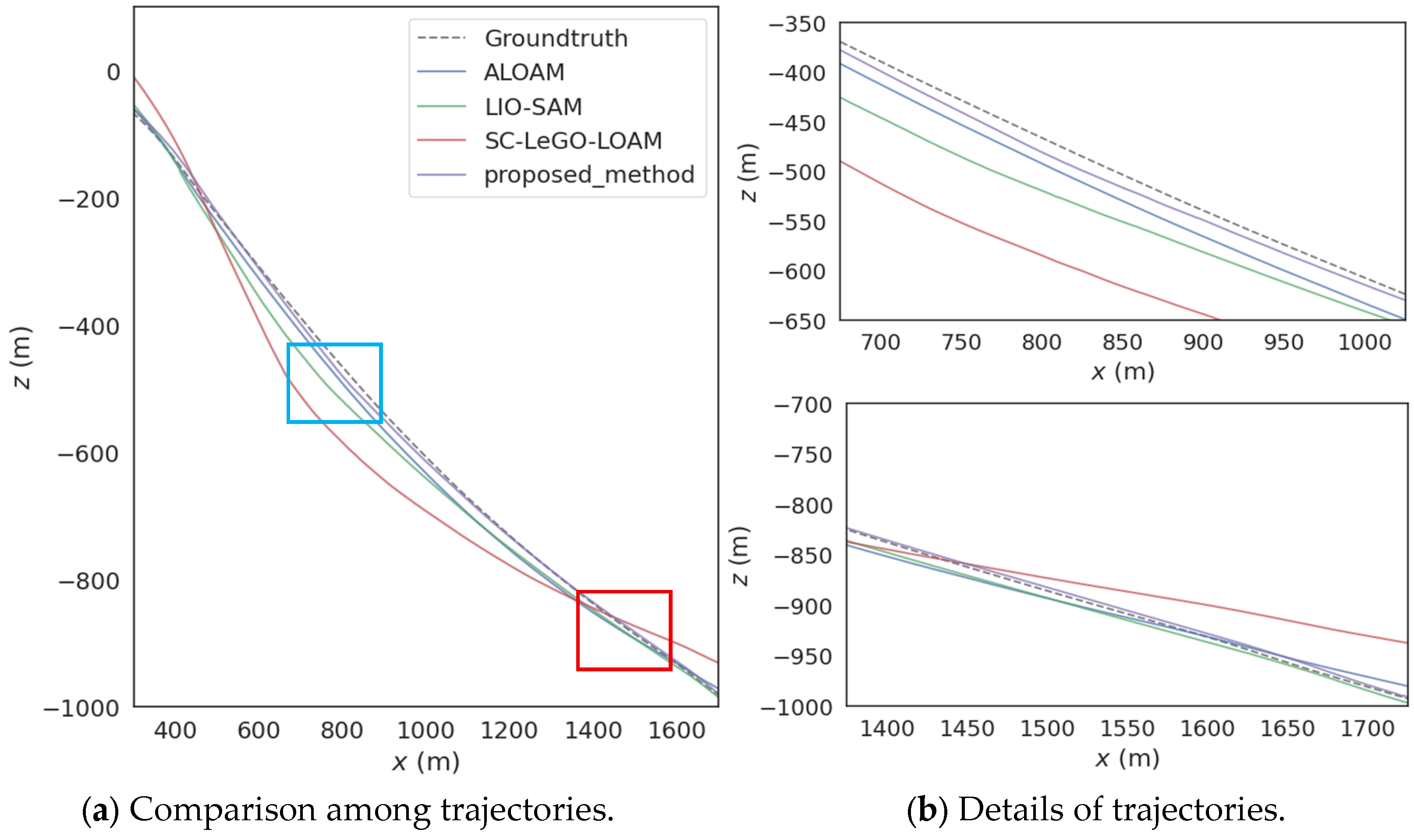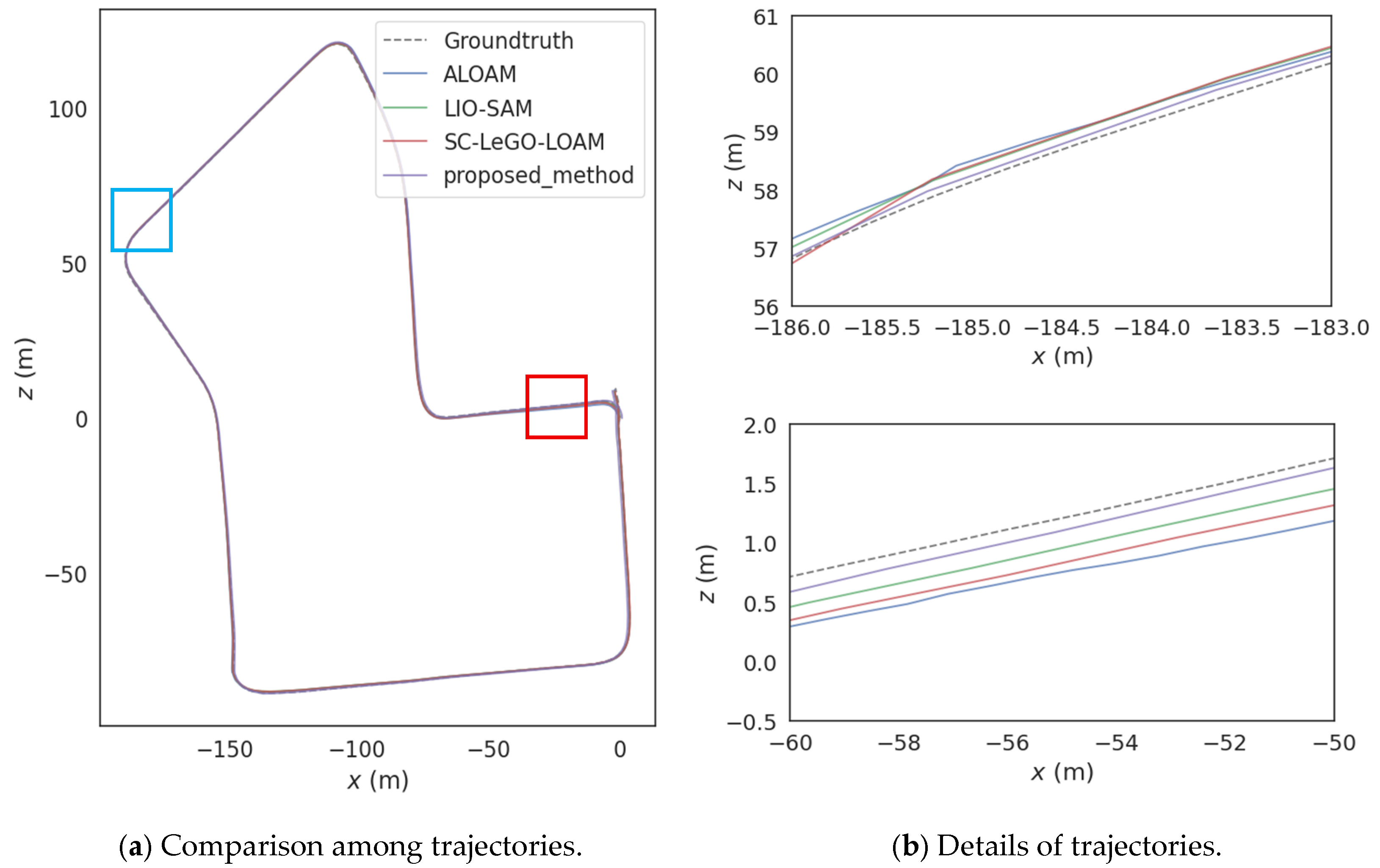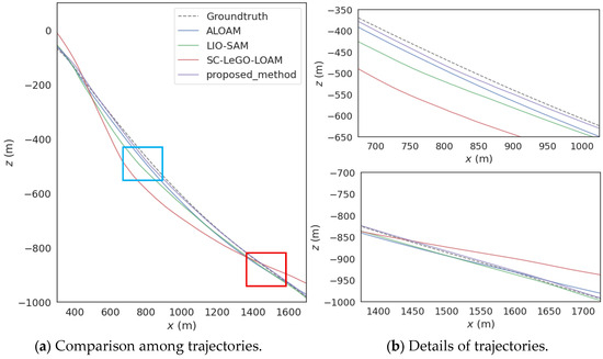 Figure 9, Figure (b) corresponds to the blue frame and red frame in Figure (a). In the town scene, there are a large number of static features. The other three algorithms use a fixed grid side length for the voxel filtering strategy of the original point clouds. However, for the rich feature information in this scene, the default grid side length results in too many feature points being lost in the downsampled point clouds after voxel filtering, leading to a decrease in the position accuracy. The adaptive voxel filtering method proposed in this paper can dynamically decrease the size of the voxel grid side length according to the size and density of the original point clouds. Thus, the number of feature point clouds input to the next stage is maintained within a reasonable range, taking into account both the accuracy of position estimation and real-time performance.