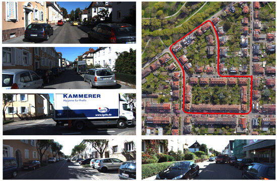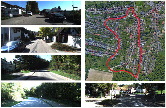 Accurate ground truth is provided by a Velodyne LiDAR scanner (Velodyne LiDAR Inc., San Jose, CA, USA) and a GPS localization system (Oxford Technical Solutions Ltd., Oxford, UK). The Velodyne LiDAR scanner, with its high-precision scanning capabilities, can capture detailed three-dimensional information of the surrounding environment. The GPS localization system, on the other hand, offers precise positioning data, ensuring accurate determination of the vehicle’s location in real time. KITTI datasets are captured by driving around the mid-size city of Karlsruhe, in rural areas, and on highways. These diverse driving scenes allow for the collection of rich and comprehensive data. In the mid-size city of Karlsruhe, various urban features such as buildings, roads, and intersections are included. Rural areas provide natural landscapes and different terrains, while highways contribute to data under high-speed and long-distance driving conditions.