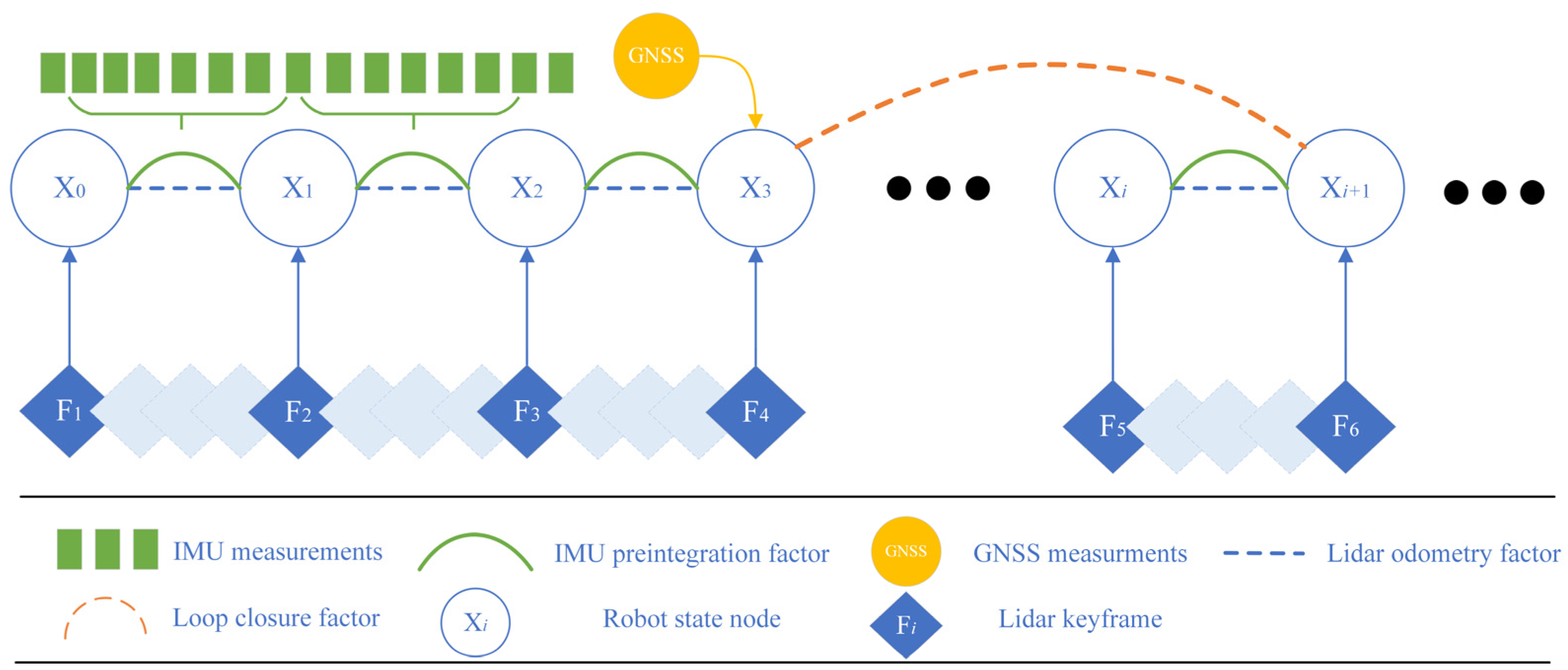 39], so that the IMU pre-integration factor can be constructed based on this pose and subsequently incorporated into the factor graph. At the same time, the loop-closure factor and GNSS factor are also incorporated into the factor graph to mitigate cumulative errors arising from prolonged operation.