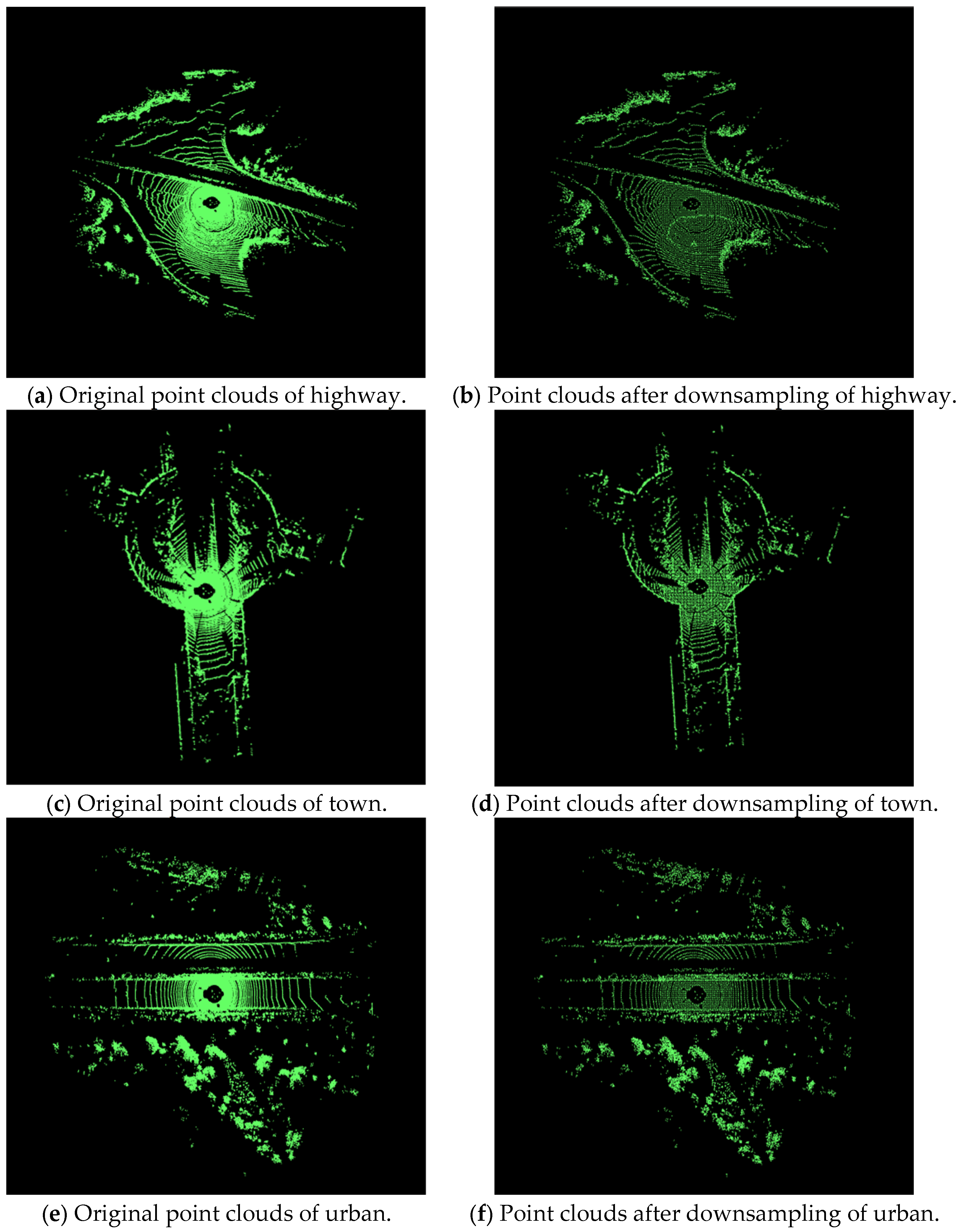 Figure 5, using a self-adaptive voxel grid filter, without losing too many feature points, the data in the point clouds has been greatly decreased. The amount of point clouds in highway scene, town scene, and urban scene is down by 91.5%, 91.2%, and 90.8%, respectively. The substantial reduction of point cloud data boosts processing efficiency and eases computational burdens. Meanwhile, minimal loss of feature points retains key information for subsequent analysis. This balance between data reduction and feature preservation verifies the feasibility of the method, ensuring the efficiency and reliability of the adaptive filtering strategy proposed in this paper.