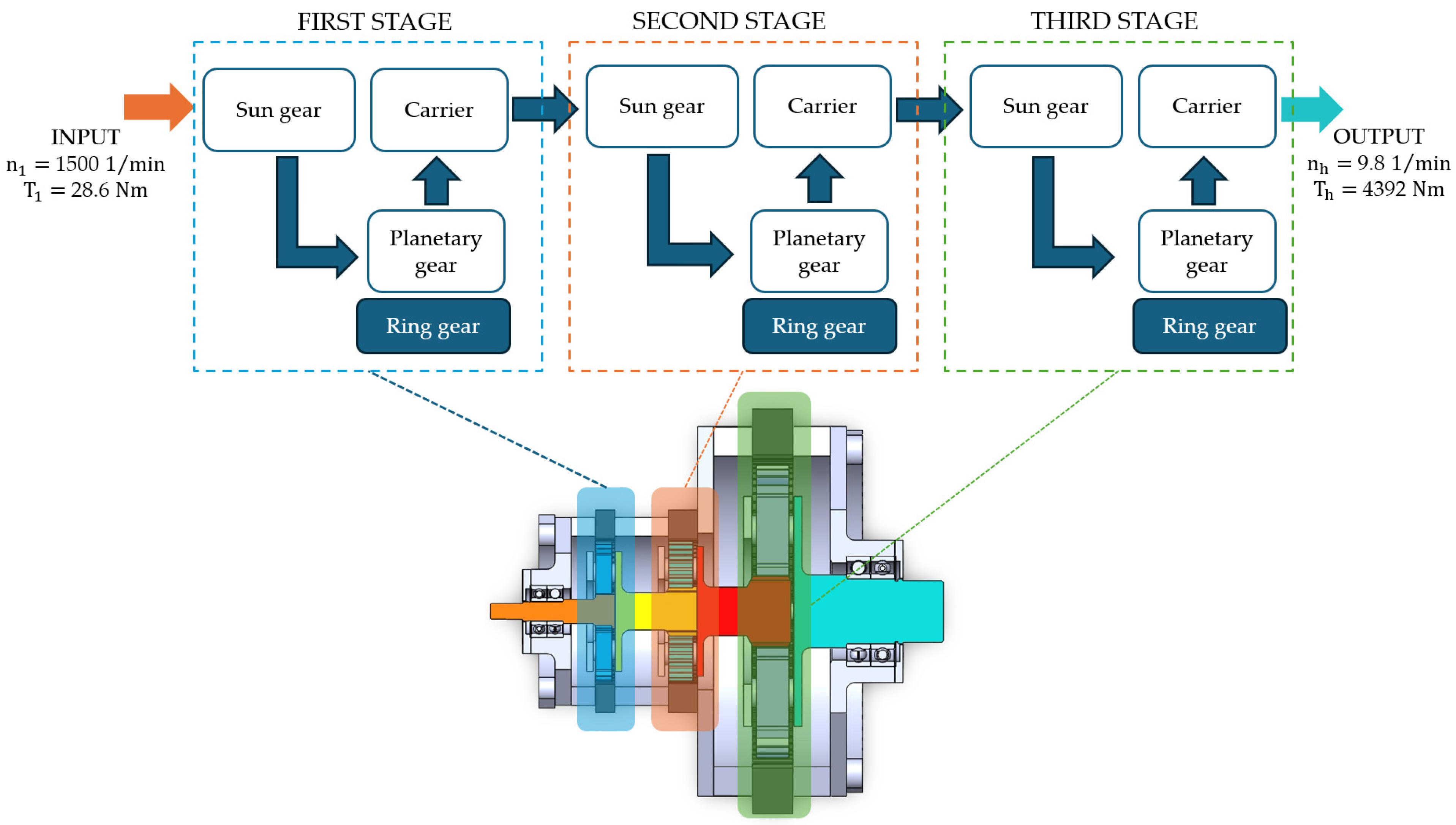 Figure 1). These stages are sequentially connected such that the output of the first stage serves as the input to the second, and the output of the second stage becomes the input to the third. Specifically, the carrier of the first stage drives the sun gear of the second stage, while the carrier of the second stage drives the sun gear of the third stage. The transmission is driven by the sun gear of the first stage, while its output is delivered through the carrier of the third stage.