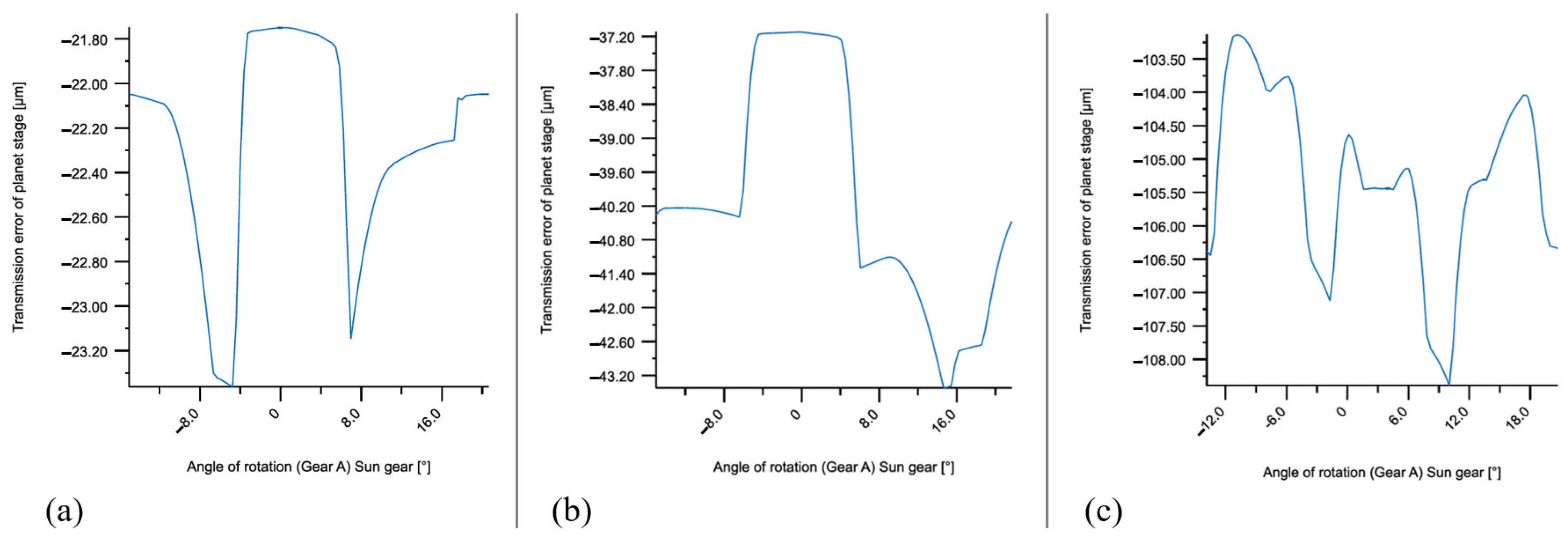 Figure 4. In the third stage, it can be observed that the curve oscillates depending on the rotation angle and transmission error, while in the first and second stage, the oscillation is less pronounced.