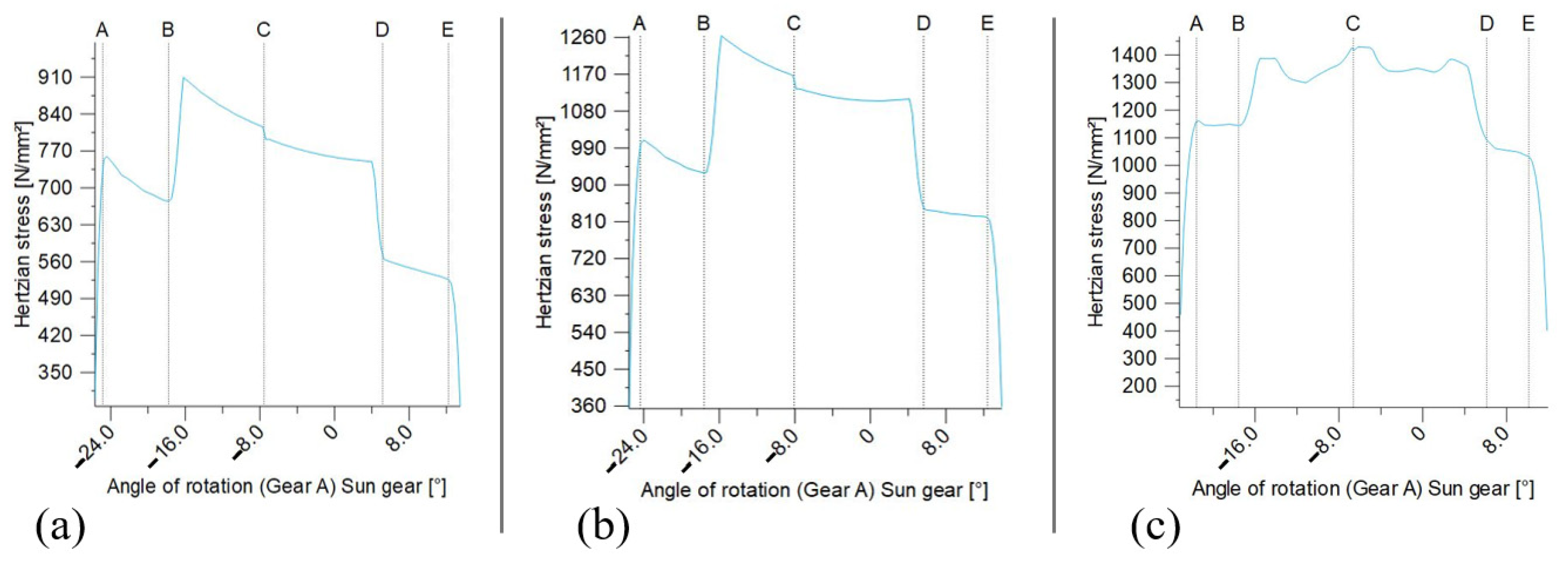 The uneven distribution of the load between the sun gear and planet gear can lead to increased Hertzian pressure on the flanks of the teeth, which later in the service life can manifest itself in the appearance of fatigue damage in the form of cracks (pitting fatigue). With that, it is necessary to show and analyze the behavior of the hertzian pressure curve in relation to the angle of rotation of the sun gear. As shown in