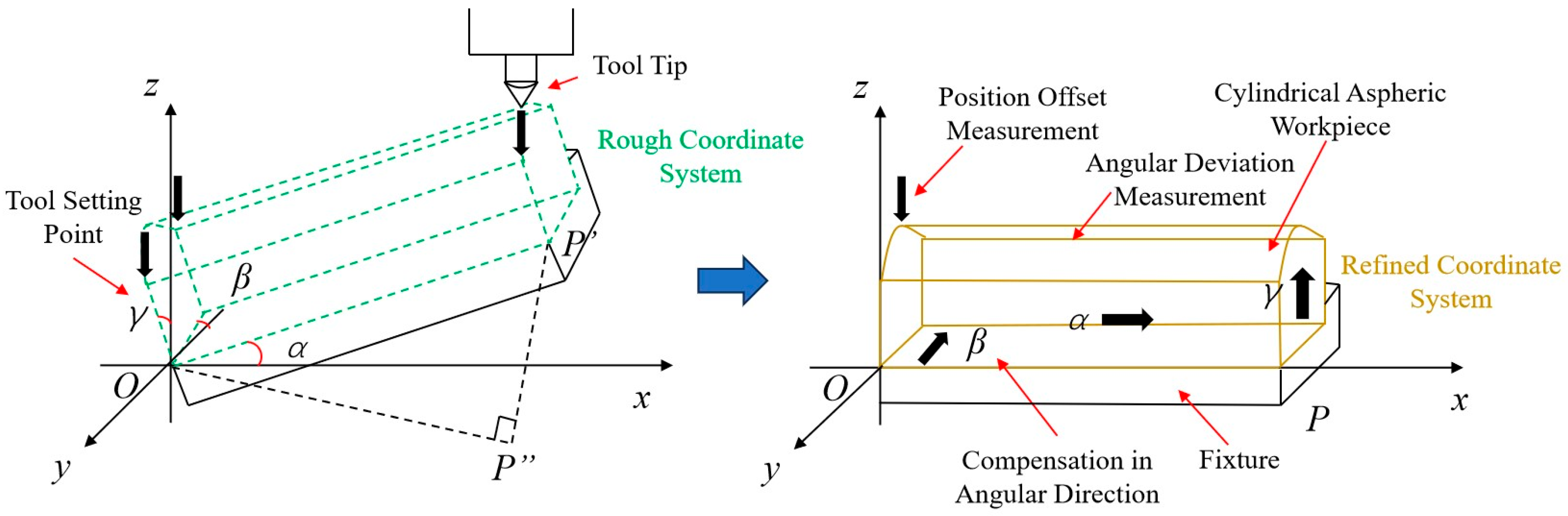 - First, the end-effector of the robotic arm approximately establishes the workpiece coordinate system. This initial step incurs an error ranging from 20 to 30 μm due to limited positioning accuracy, which encompasses deviations in three spatial directions and positions.