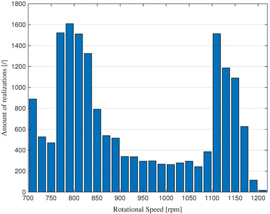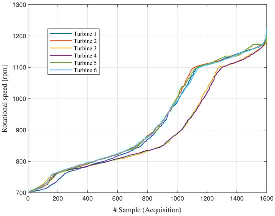 To minimize the impact of speed variability while maximizing the number of usable samples, Figure 3 presents the histogram of speed values across the six turbines. Two distinct speed intervals exhibit the highest concentration of data points (number of realizations), with the most populated range falling within rpm. For each turbine, a subset of the raw data was selected, including only the measurements corresponding to this specific speed range. Then, Hjorth’s parameters were computed on these filtered subsets. The mean values of the parameters, calculated over the last 10 samples with the highest speeds (i.e., approaching 850 rpm), were used as reference values for the Detectivity computation. In this analysis, the reference values were arbitrarily derived from Turbine 1.