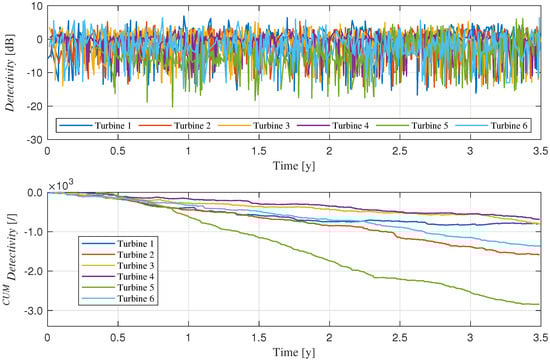 Detectivity has been successfully applied to both simulated and real-world datasets, to track rolling bearing degradation [26] and, in a preliminary work, for condition monitoring of wind turbines [27], demonstrating its robustness, sensitivity, and suitability for real-time condition monitoring: it is a statistical parameter easy to apply and effective, offering a practical alternative to more complex signal analysis techniques and machine learning algorithms, which may lead to similar results with significantly greater effort.
