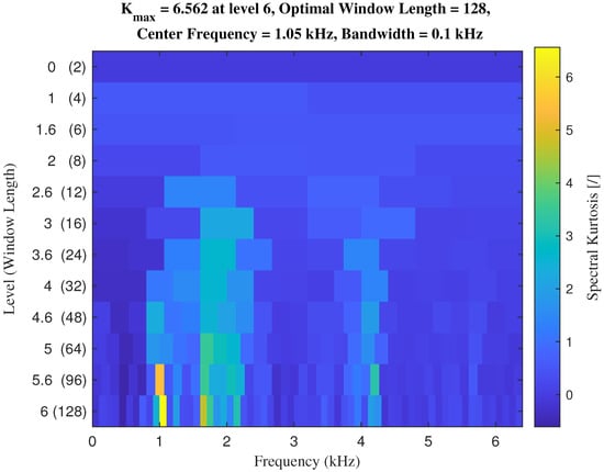 From a comparative perspective, an attempt was made to achieve the same result using a well-established analysis method, as the Spectral Kurtosis. In an analogy with the computational methodology adopted for the Detectivity analysis, the same dataset of acceleration signals was used, selecting only those within the speed range exhibiting the highest concentration of samples, in order to ensure a full degree of comparability. By employing a fast-computation Kurtogram [33], the maximum kurtosis value was extracted for each signal. This resulted in a matrix of values, structured according to the number of machines and the number of data samples (acquisitions) falling within the selected rotational speed interval. In Figure 5, an example of Kurtogram is shown: it is possible to appreciate how, through successive levels of decomposition, the frequency band exhibiting the highest kurtosis value, which is assumed to contain the vibrational signature of a potential fault, is identified. In the present analysis, a decomposition level of 6 was selected (the remaining parameters are derived from this one), as further increasing the level did not yield any refinement in the results. Furthermore, higher decomposition levels are rare to find in the literature since excessive fragmentation can be inconvenient, as well as increasing the computational burden.