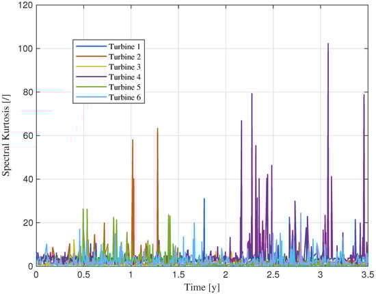 Behavior of Spectral Kurtosis over the monitoring period for each turbine.