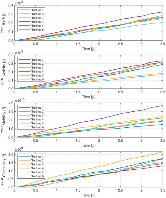 Finally, the behavior of the RMS and Hjorth parameters, according to their cumulative formulations, is presented over the monitoring period (see Figure 8), also in this case based on data selected according to the criterion of highest sample concentration within the previously defined rotational speed range. The analysis reveals that none of the parameters successfully identify the turbine actually affected by damage. With the exception of the Complexity parameter, Turbine 4 is erroneously highlighted as the one exhibiting the highest values. Moreover, a clear deviation from the other curves is observed only in the case of the Mobility parameter. This outcome closely resembles the results obtained through Spectral Kurtosis analysis, further suggesting that these metrics may be sensitive to signal characteristics that do not necessarily correlate with actual fault conditions.